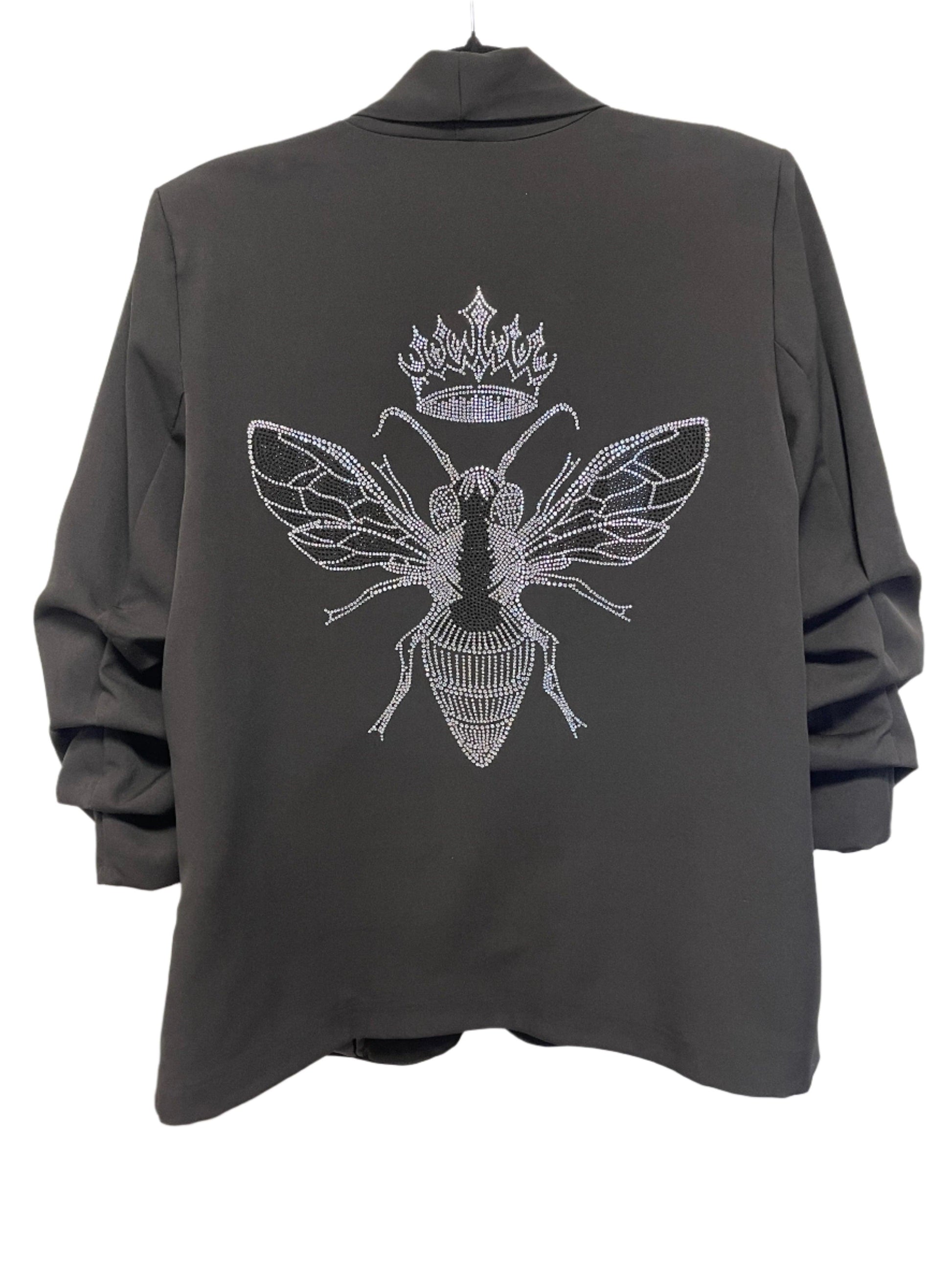 Our Signature Black Blazer is an essential addition to any wardrobe. With a lightweight, tailored fit and ruched sleeves, it's the perfect balance of style and comfort. This one features our stunning crystal silver queen bee design. You'll be turning heads at any occasion.