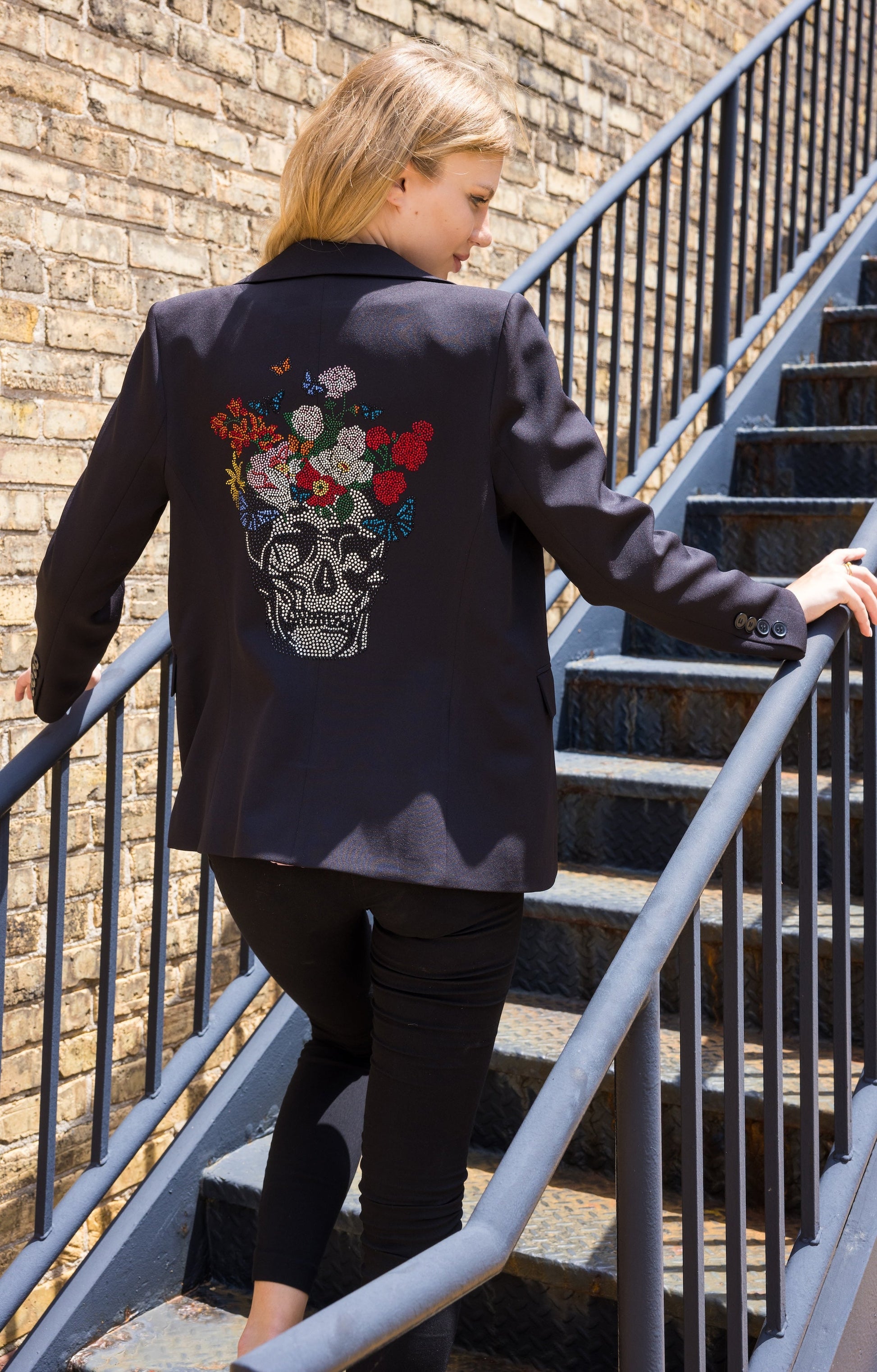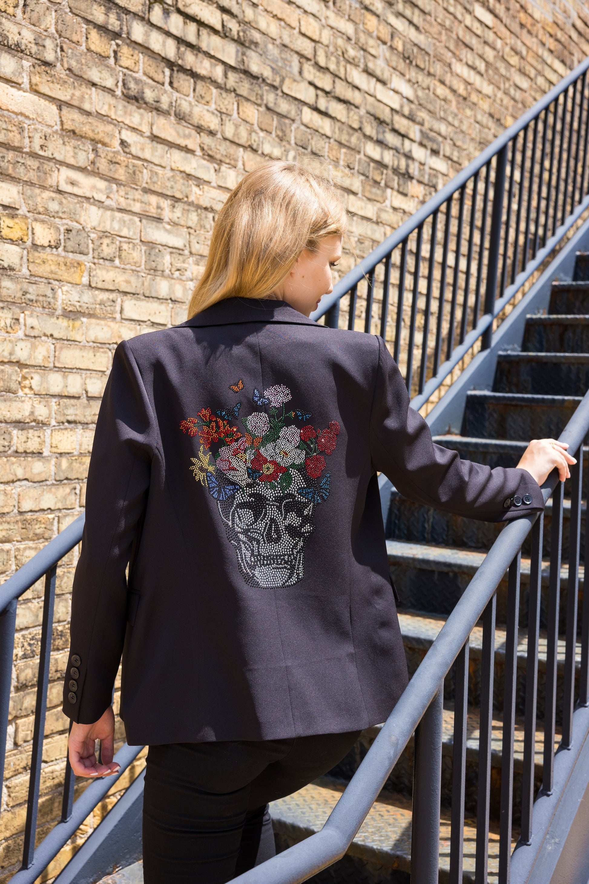 This stunning black blazer is constructed with a bold pink lining, a classic fit, and is embellished with our beautiful crystal skull flowers design. Its unique design will make you stand out from the crowd while maintaining timeless elegance. Wear the sleeves rolled up to show off the pink lining or down for a more formal look. Perfect for any occasion, elevate your wardrobe and add a subtle hint of glamour with this versatile piece.