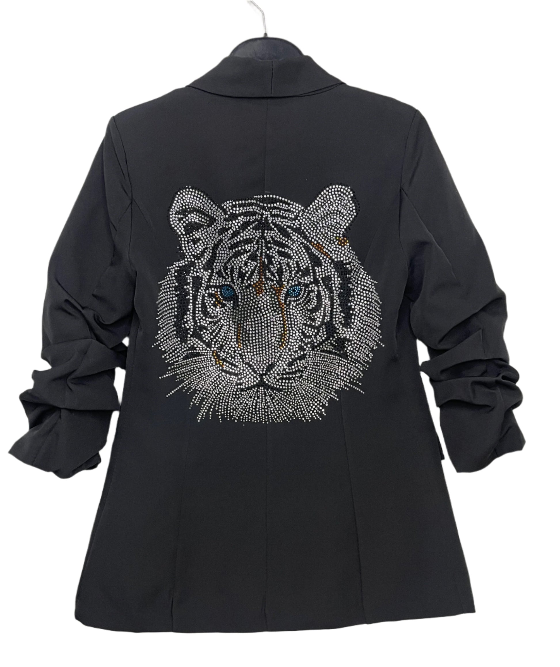 Our Signature Black Blazer is an essential addition to any wardrobe. With a lightweight, tailored fit and ruched sleeves, it's the perfect balance of style and comfort. This one features our crystal silver tiger face on the back. You'll be turning heads at any occasion.