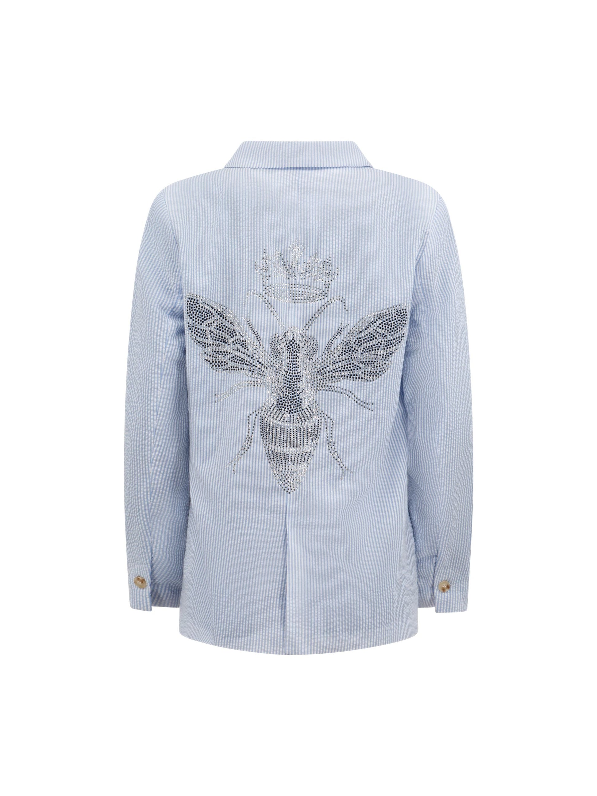 This blue seersucker blazer features our gorgeous crystal rhinestone bee. Crafted from seersucker material, this blazer provides a lightweight and breathable fit, perfect for warmer weather. Its timeless design adds a touch of elegance to any outfit. Stay stylish and sophisticated with this unique piece.