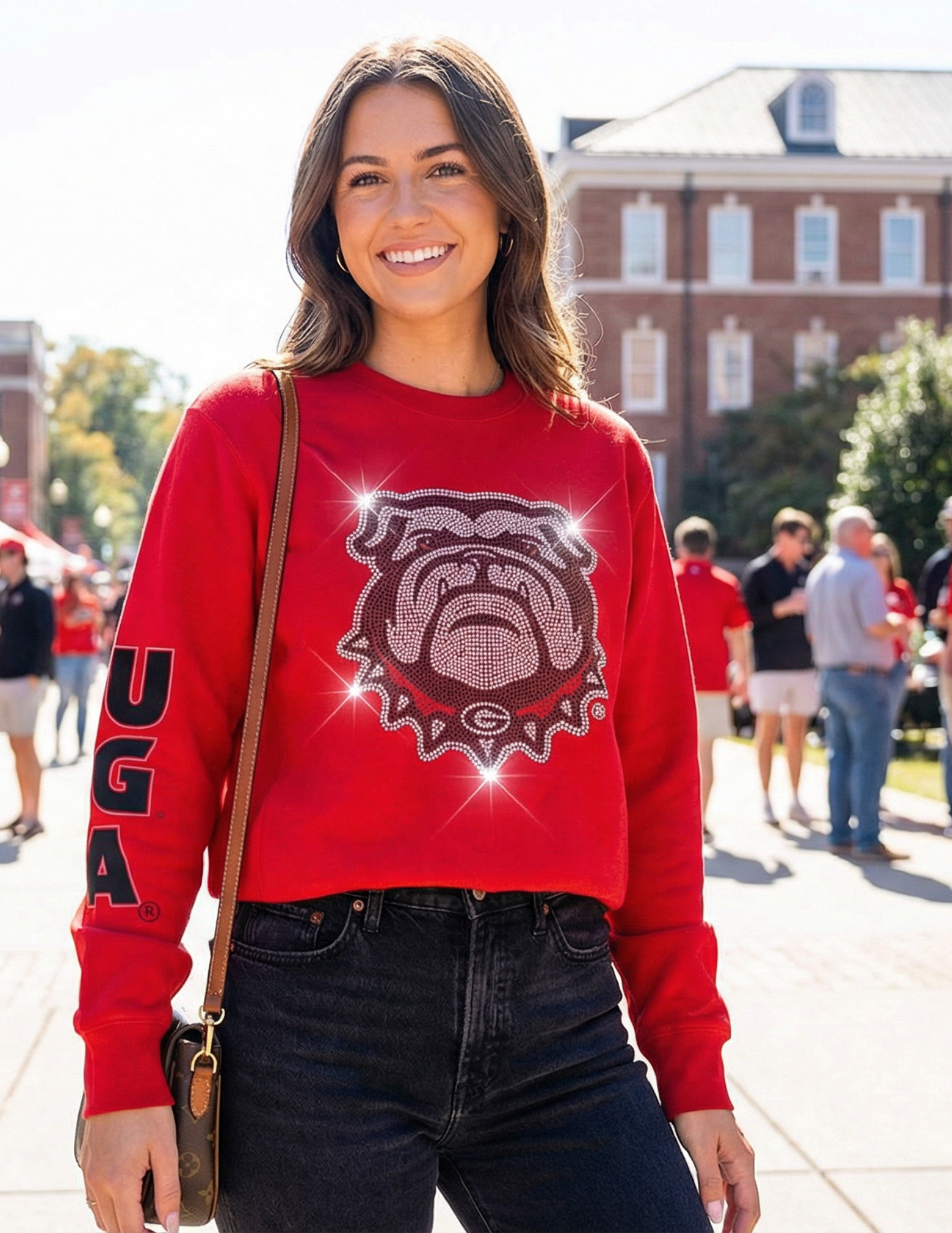 Celebrate game day in style with this University of Georgia red sweatshirt featuring a dazzling rhinestone logo. The sparkling rhinestone design adds a unique and eye-catching touch, perfect for showing off your team pride. Made from comfortable, high-quality fabric, this sweatshirt ensures durability and warmth during every game. It combines authentic team spirit with fashionable appeal, making it an essential part of any fan’s wardrobe. Ideal for game days or casual wear, this rhinestone logo sweatshirt offers both comfort and standout style.
