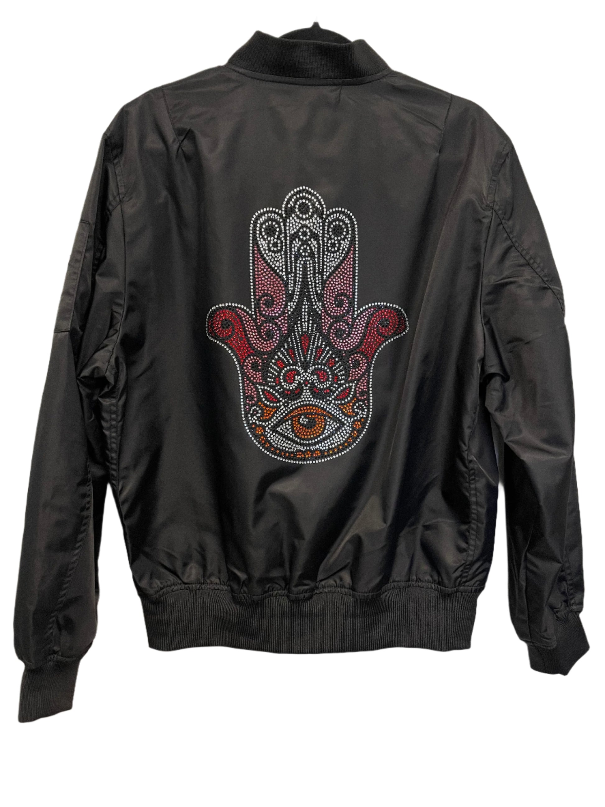 Make a bold statement with meaning. This luxe black bomber features a shimmering pink crystal Hamsa on the back—an ancient symbol of protection, luck, and strength. Designed with a sleek, modern fit and elevated embellishment, it blends streetwear edge with spiritual energy. Whether layered for game day or styled for a night out, this piece turns heads and sparks conversation.