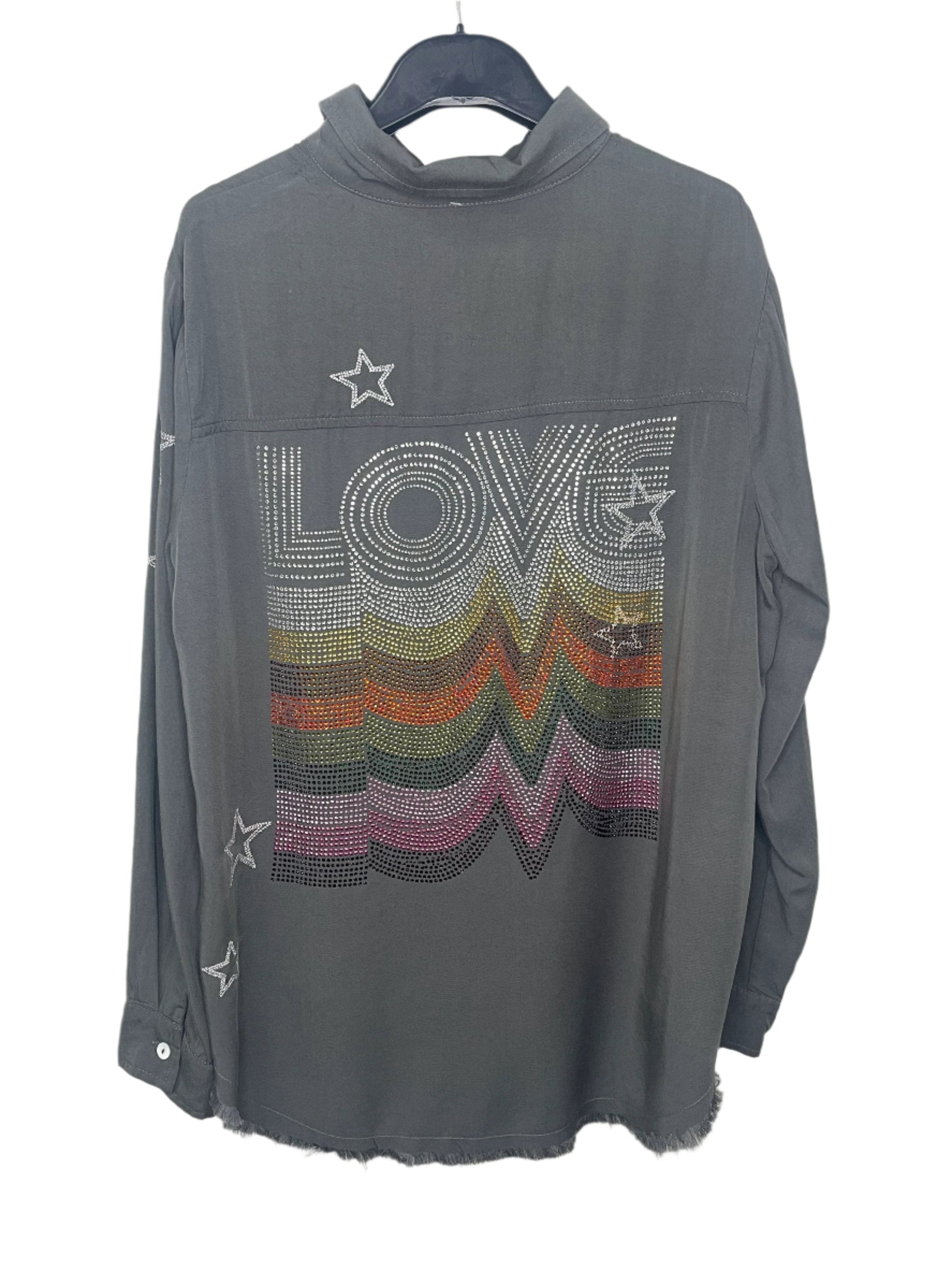 Our embroidered star shirts are a super soft and lightweight take on the classic button-down shirt. Made with tencel, this shirt features mother of pearl buttons, embroidered stars throughout, a classic fit, raw hem and pockets at the chest. This one features our signature crystal love repeater design on the back. Wear open with a tee for a laidback look or buttoned-up for a classic look.