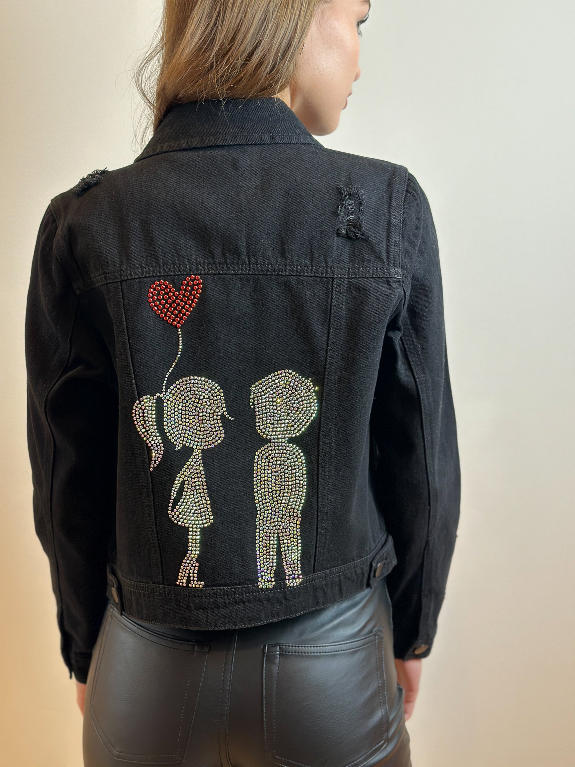 Stay stylish and comfortable with our black denim jacket with a silver crystal design on the back. This jacket will add a touch of fun to any outfit. Made with durable lightly distressed denim and expert craftsmanship, this jacket is perfect for any fashion-forward individual.
