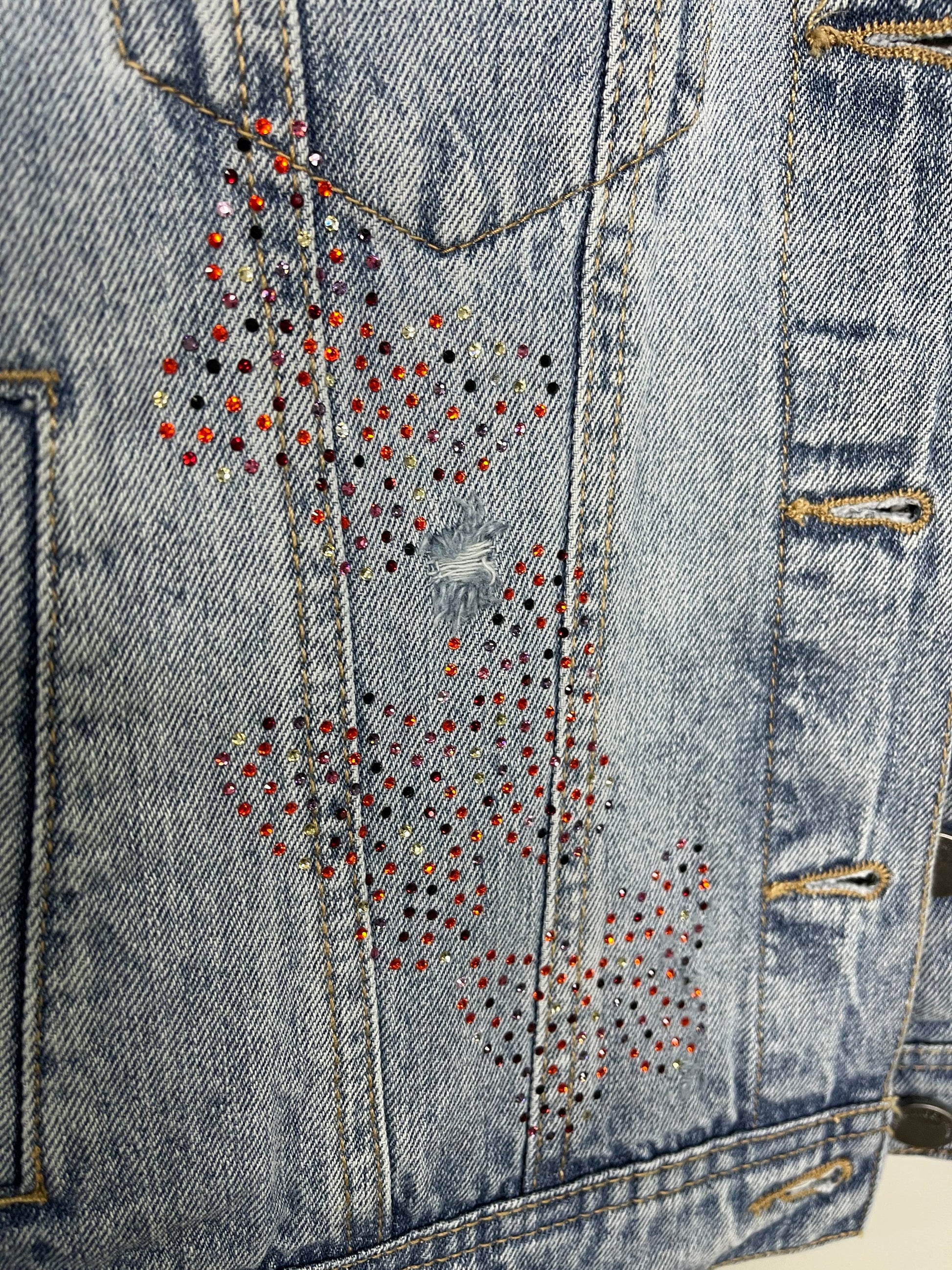 Complete your look in our denim jacket with butterflies. Crafted from a lightly distressed blue denim, this jacket is perfect for any occasion. Add a touch of fun to any outfit!