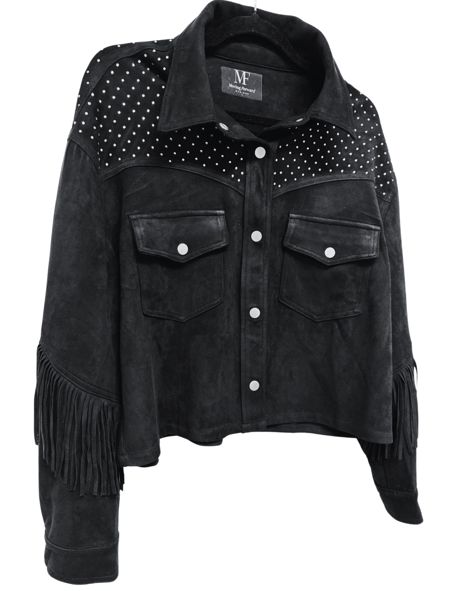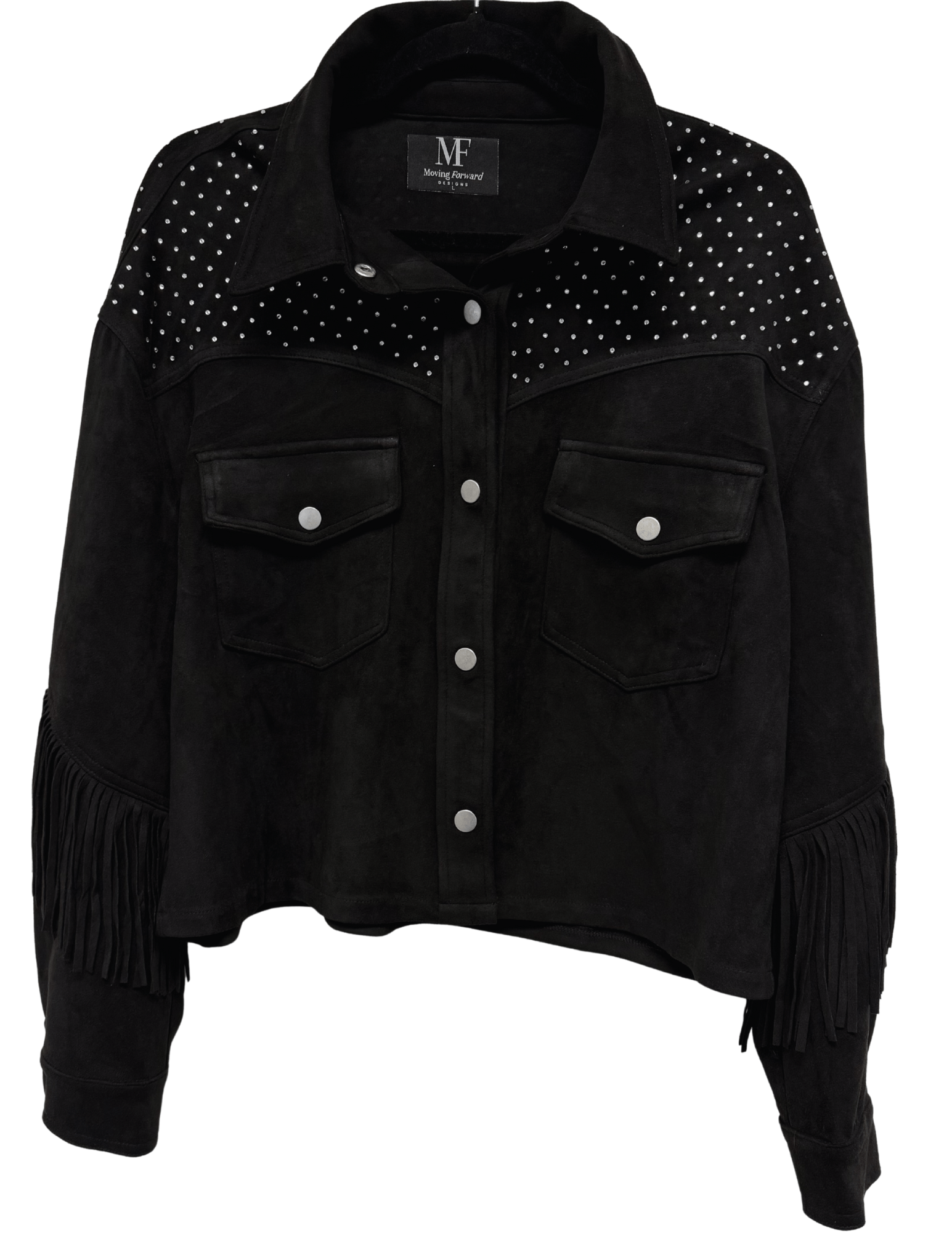 This black suede jacket features stylish fringe details and beautiful crystal waterfall details adding a touch of flair to your outfit. Crafted with high-quality materials, this jacket is both durable and fashionable, making it a must-have addition to your wardrobe. Elevate your style with this statement piece.