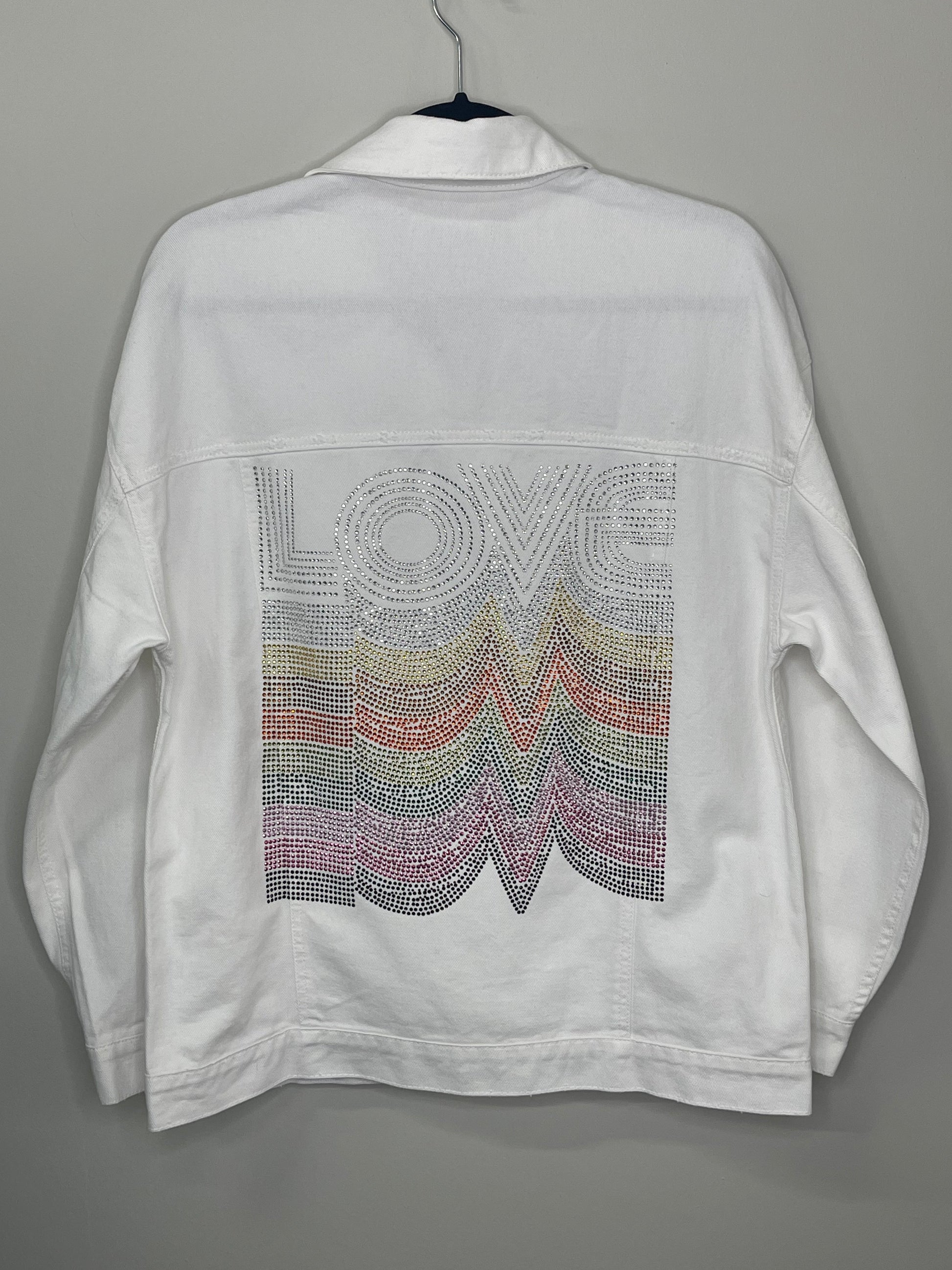 Complete your look in this white denim jacket with our signature crystal love repeater design. Crafted from a lightly distressed denim, this jacket is perfect for any occasion. Add a touch of fun to any outfit!
