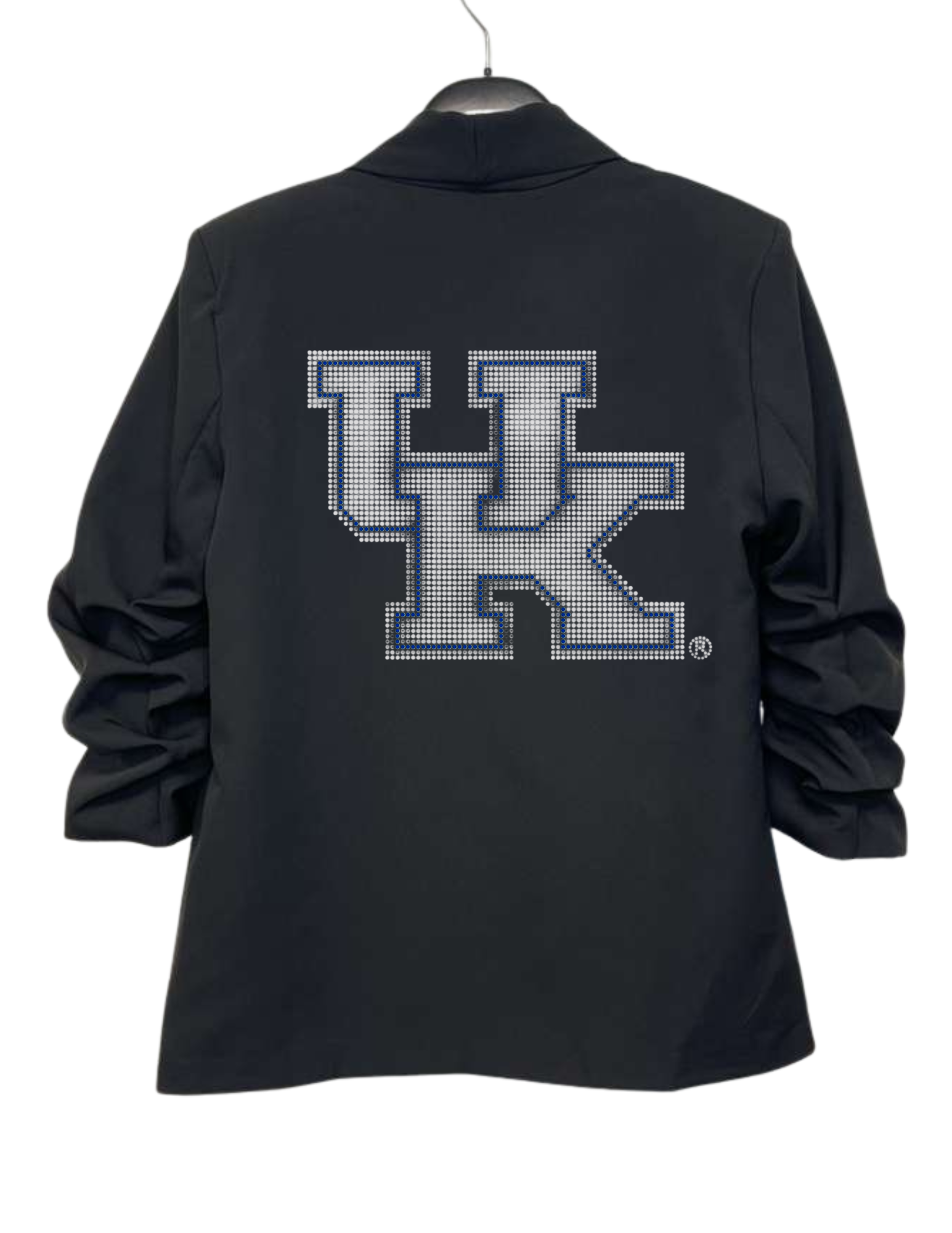 Show your University of Kentucky pride with the Game Day Blazer in black, featuring elegant ruching and a sparkling rhinestone emblem. This sophisticated blazer combines team spirit with refined style, perfect for game days and spirited events. Crafted with licensed authenticity, it offers both comfort and a standout look that highlights your Wildcats loyalty with subtle, expert detailing. Elevate your game day wardrobe with this unique piece designed for true fans.