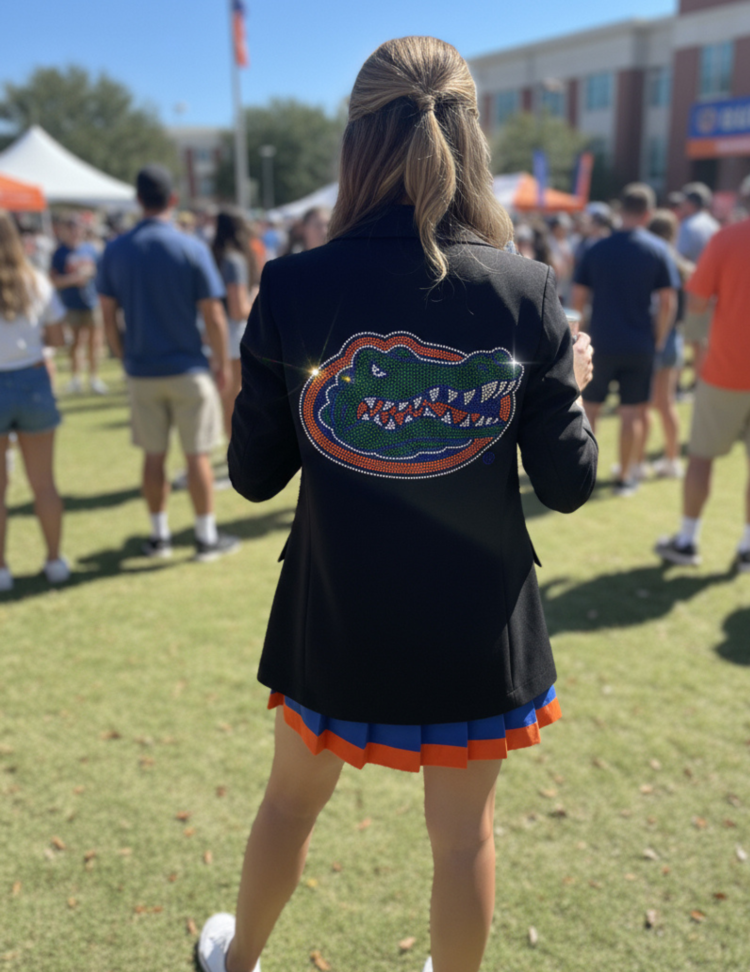 Show your University of Florida Gators pride with this Game Day Blazer in black ruched fabric. Featuring a stunning rhinestone gator head emblem, this blazer combines elegance with spirited fandom. Perfect for game days or special events, it adds a polished touch to your outfit while showcasing your team loyalty with expert craftsmanship and eye-catching sparkle.