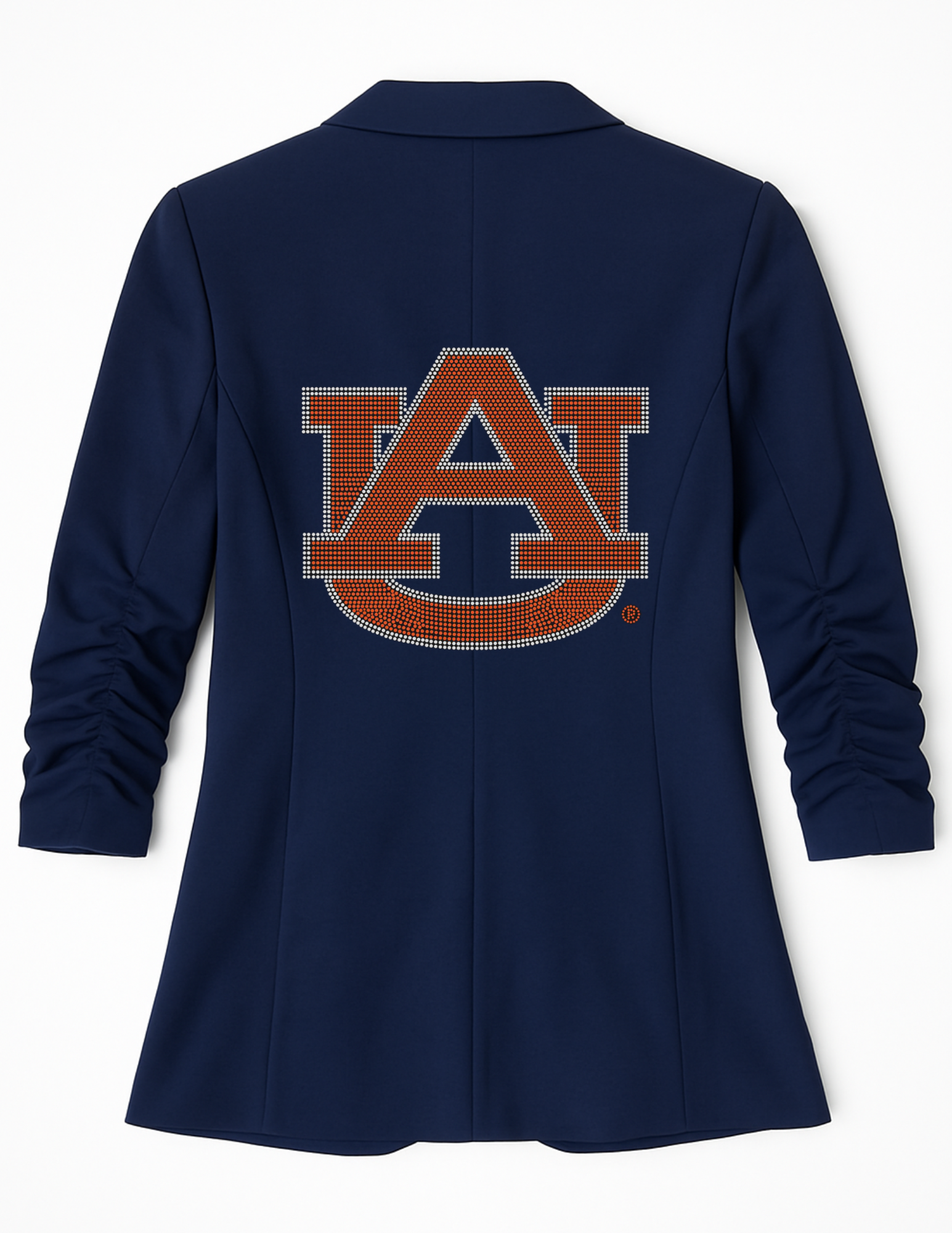 Elevate your game day wardrobe with the Game Day Blazer in navy blue, featuring a sparkling rhinestone logo proudly showcasing the Auburn University logo. This stylish blazer combines team spirit with sophisticated design, perfect for showing your Auburn pride at any event. The classic cut and ruched sleeves offers a flattering fit, while the rhinestone logo adds an eye-catching touch of elegance. Ideal for fans seeking a polished yet spirited look, this blazer is a must-have for campus events, tailgates, and beyond.
