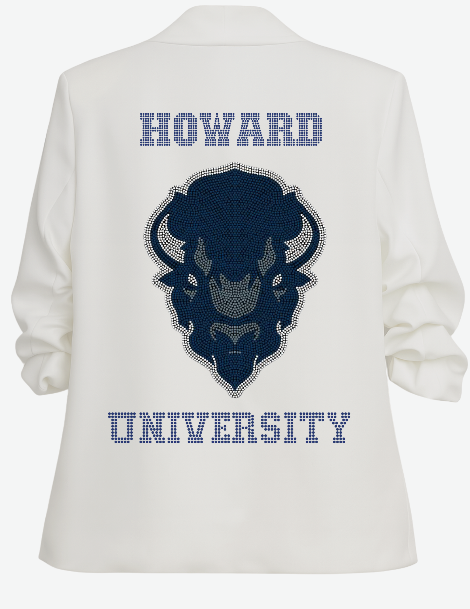 Elevate your game day style with this Howard University Bison blazer, featuring a striking rhinestone logo that captures school pride with sophistication. The ruched white design offers a flattering silhouette while the embellished script and mascot detailing showcase authentic university branding. Perfect for tailgates, campus events, or spirited occasions, this blazer combines premium construction with eye-catching sparkle. An essential piece for dedicated Bison fans who demand both quality and standout style.