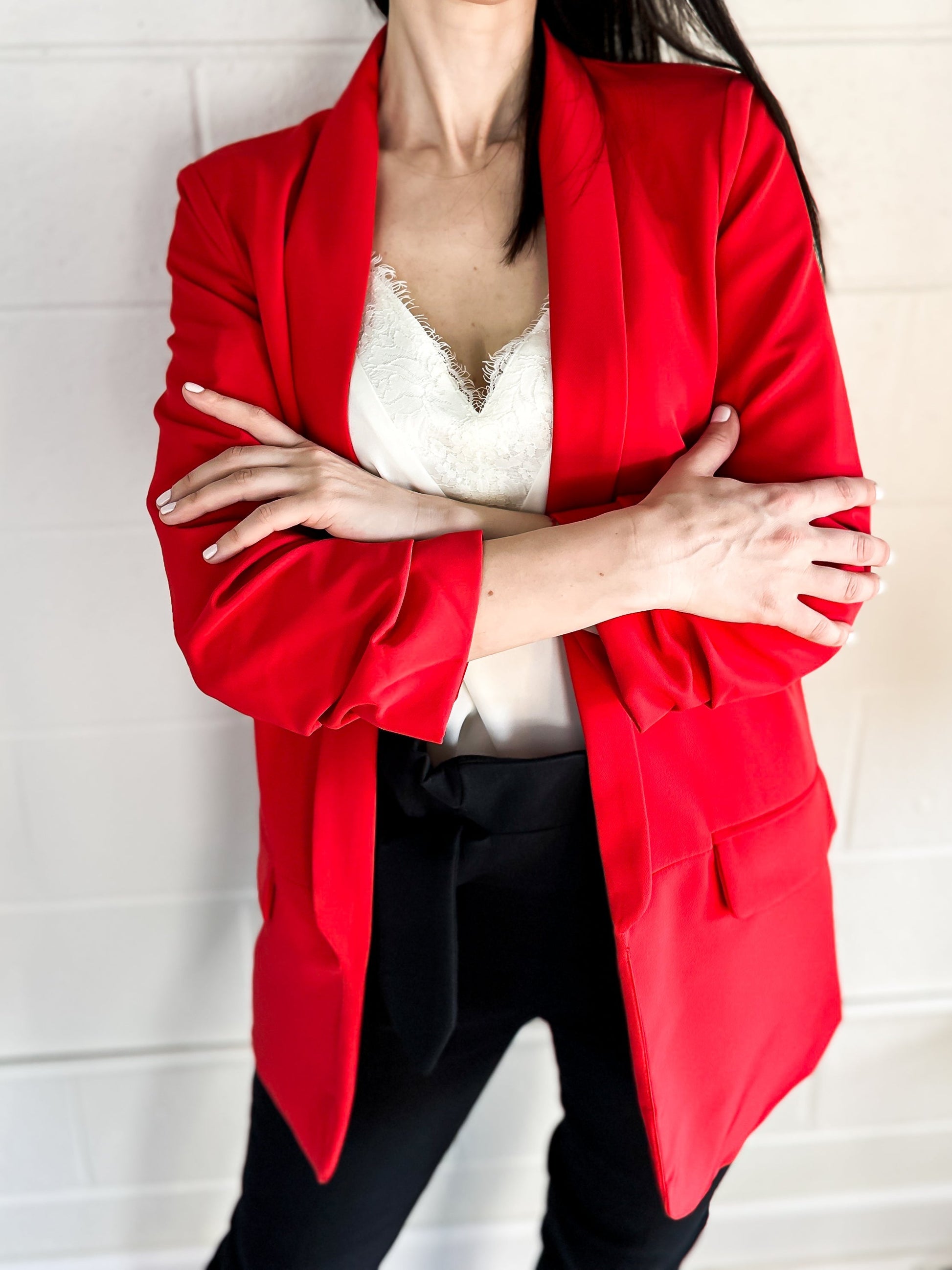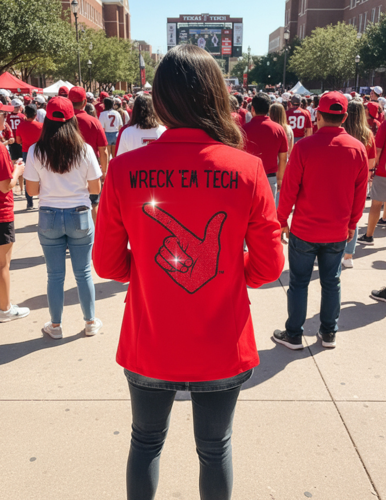 Elevate your game day style with this Texas Tech blazer, featuring the iconic Wreck Em Tech Guns Up hand embellished with eye-catching rhinestones. The rich red fabric is expertly ruched for a flattering, dynamic silhouette that commands attention in the stands or at tailgate events. Perfect for devoted Red Raiders fans who want to showcase their school spirit with sophistication and flair. This statement piece combines collegiate pride with polished elegance, making it an essential addition to any Texas Tech fan's wardrobe.