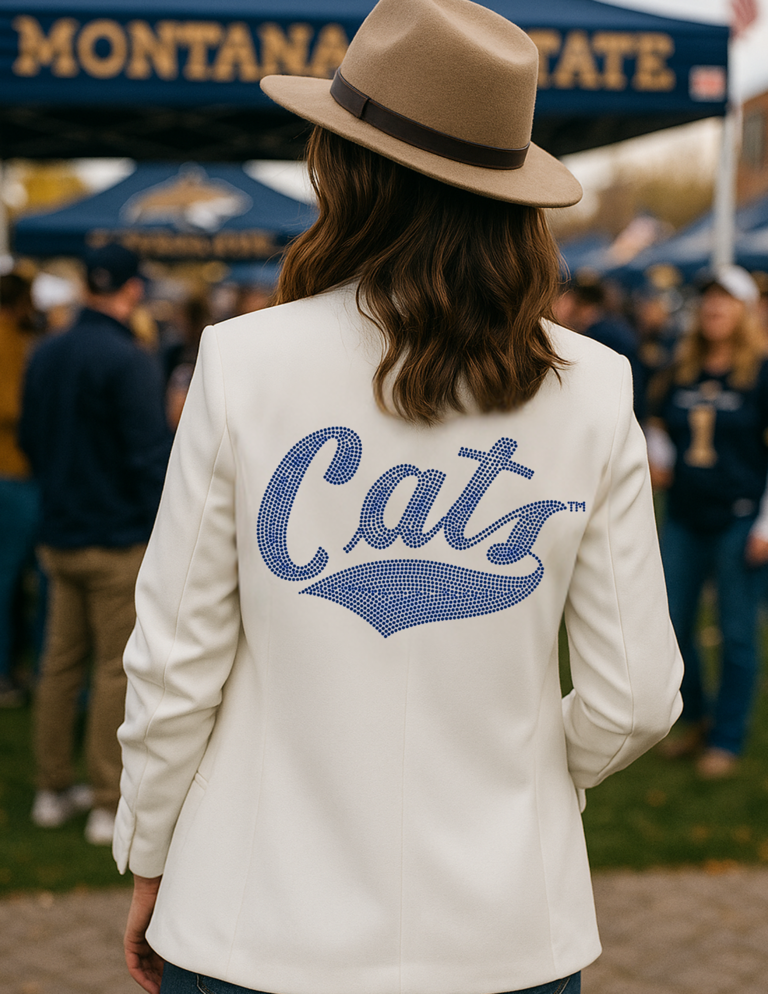Elevate your game day look with this Montana State Cats blazer in crisp white, featuring elegant rhinestone detailing that adds a subtle sparkle. Perfectly tailored for a sharp, professional appearance, it showcases the iconic Montana State Cats script, blending team pride with sophisticated style. Ideal for fans seeking a polished yet spirited outfit for any event.