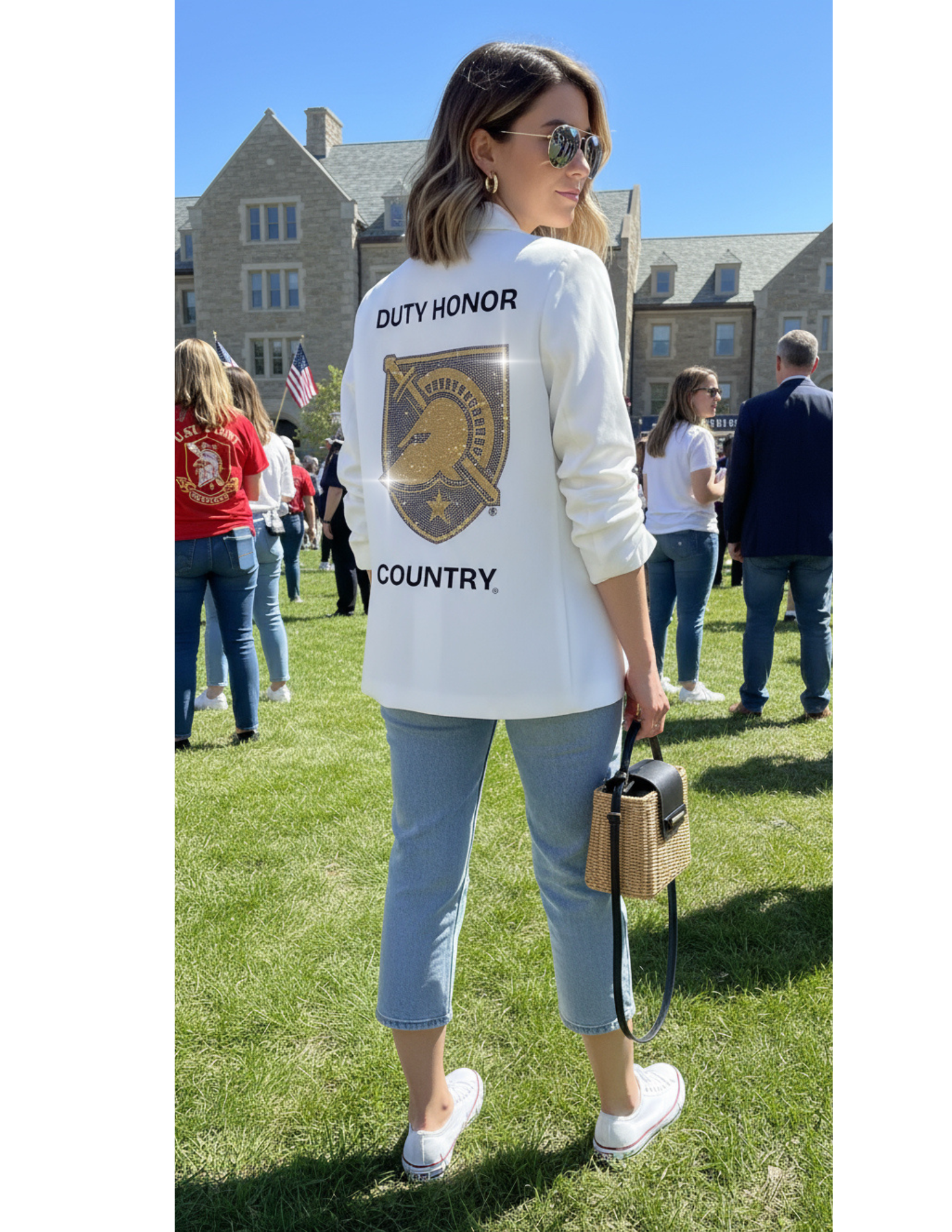 Elevate your game day attire with this sophisticated Game Day Blazer in crisp white ruched fabric. Featuring premium rhinestone embellishments showcasing the Army West Point "Duty Honor Country" motto and Athena Shield insignia. This tailored piece combines collegiate pride with professional elegance, perfect for alumni events, special campus functions, or showing team spirit with distinguished style.