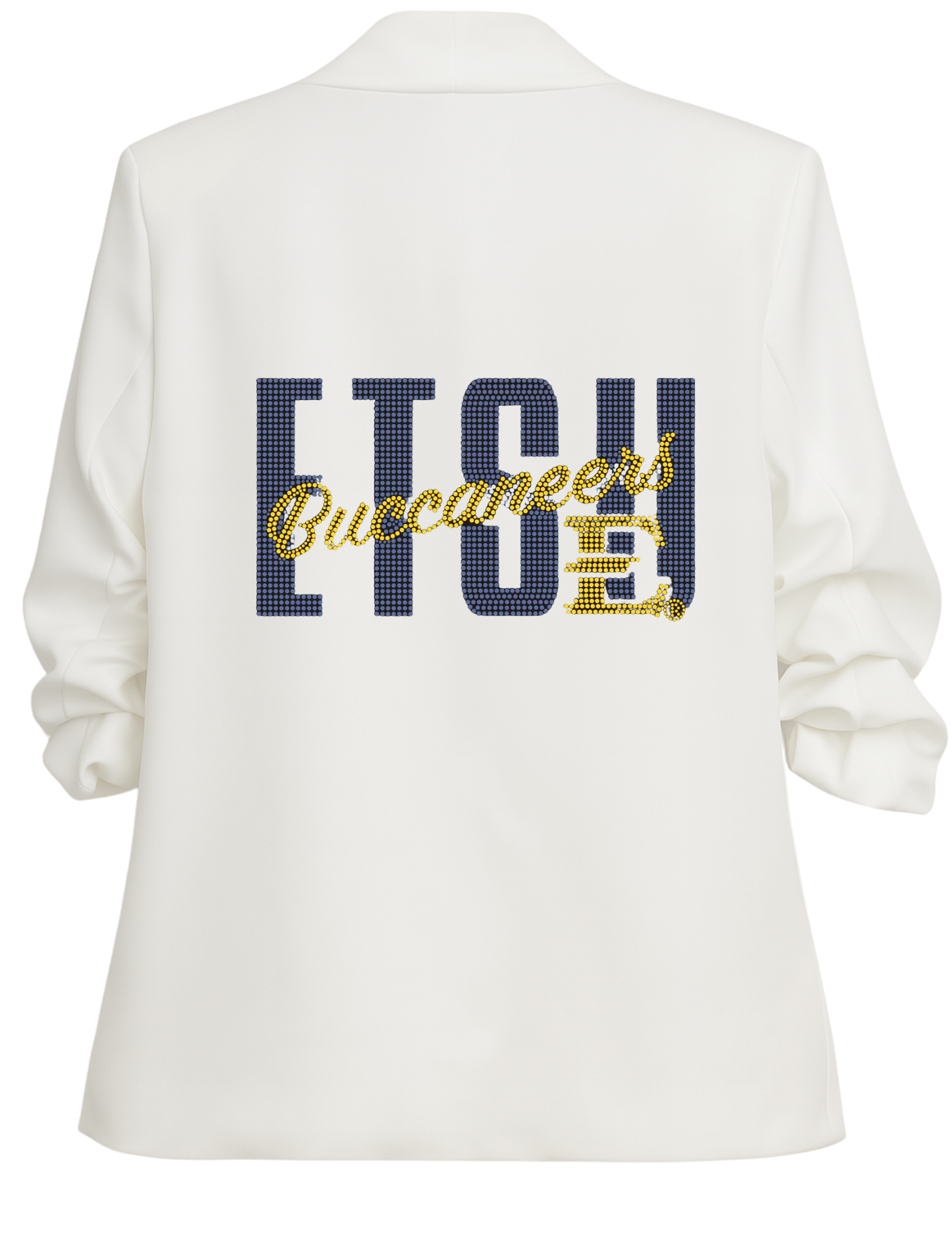 Elevate your game day attire with this East Tennessee State blazer in crisp white with sophisticated ruched detailing. Meticulously crafted to combine collegiate pride with professional elegance, this statement piece allows you to showcase your ETSU spirit while maintaining a polished appearance. Perfect for alumni events, homecoming celebrations, or any occasion requiring spirited sophistication.