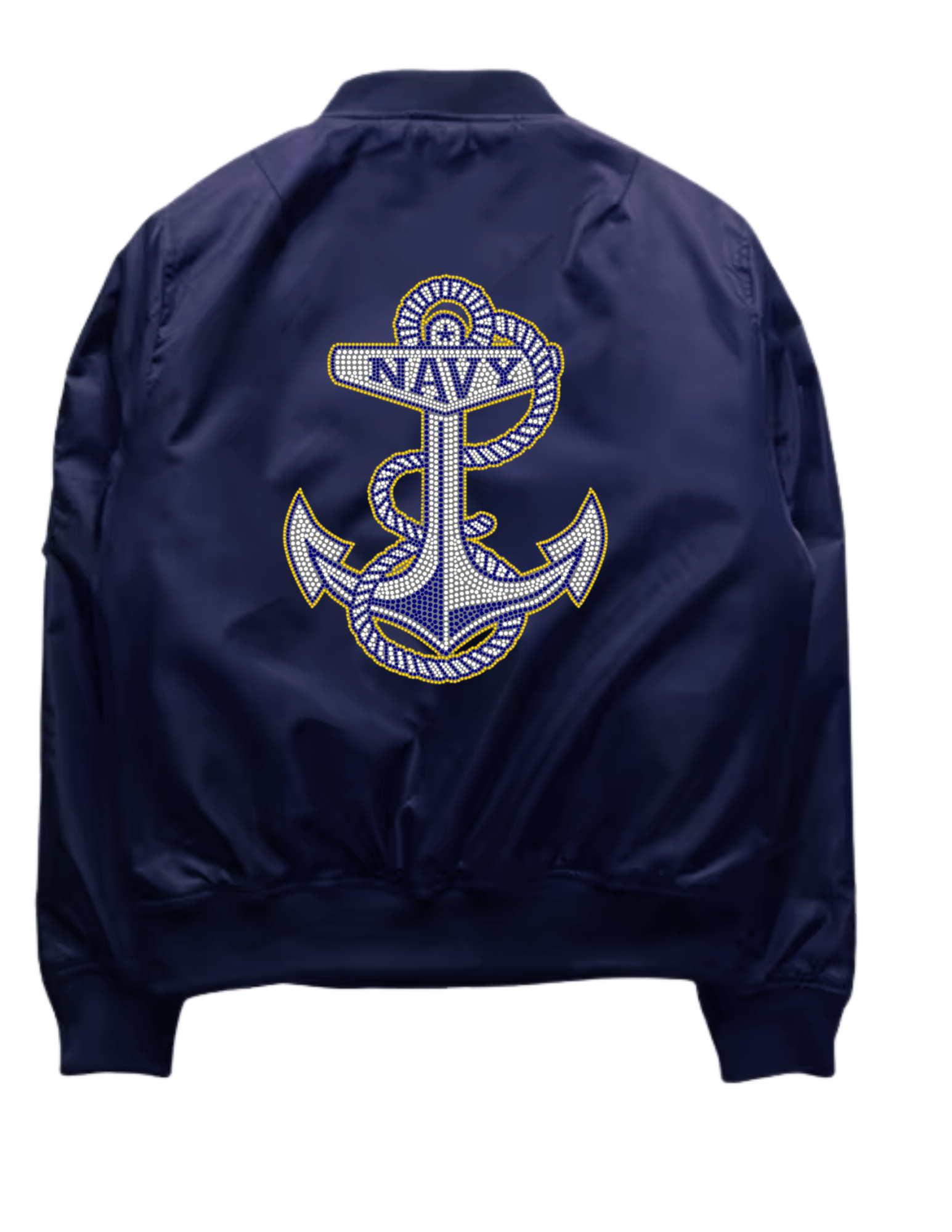 Game Day Bomber Navy Naval Academy Anchor Rhinestone Logo Elevate your game day wardrobe with this officially licensed Naval Academy bomber jacket, featuring a striking rhinestone anchor emblem. The classic navy colorway delivers timeless sophistication, while the embellished logo adds eye-catching sparkle and authentic school pride. Crafted for fans who demand quality and style, this piece transitions seamlessly from stadium to street. Perfect for alumni, cadets, and Navy supporters seeking a premium statement piece that combines heritage with contemporary flair.