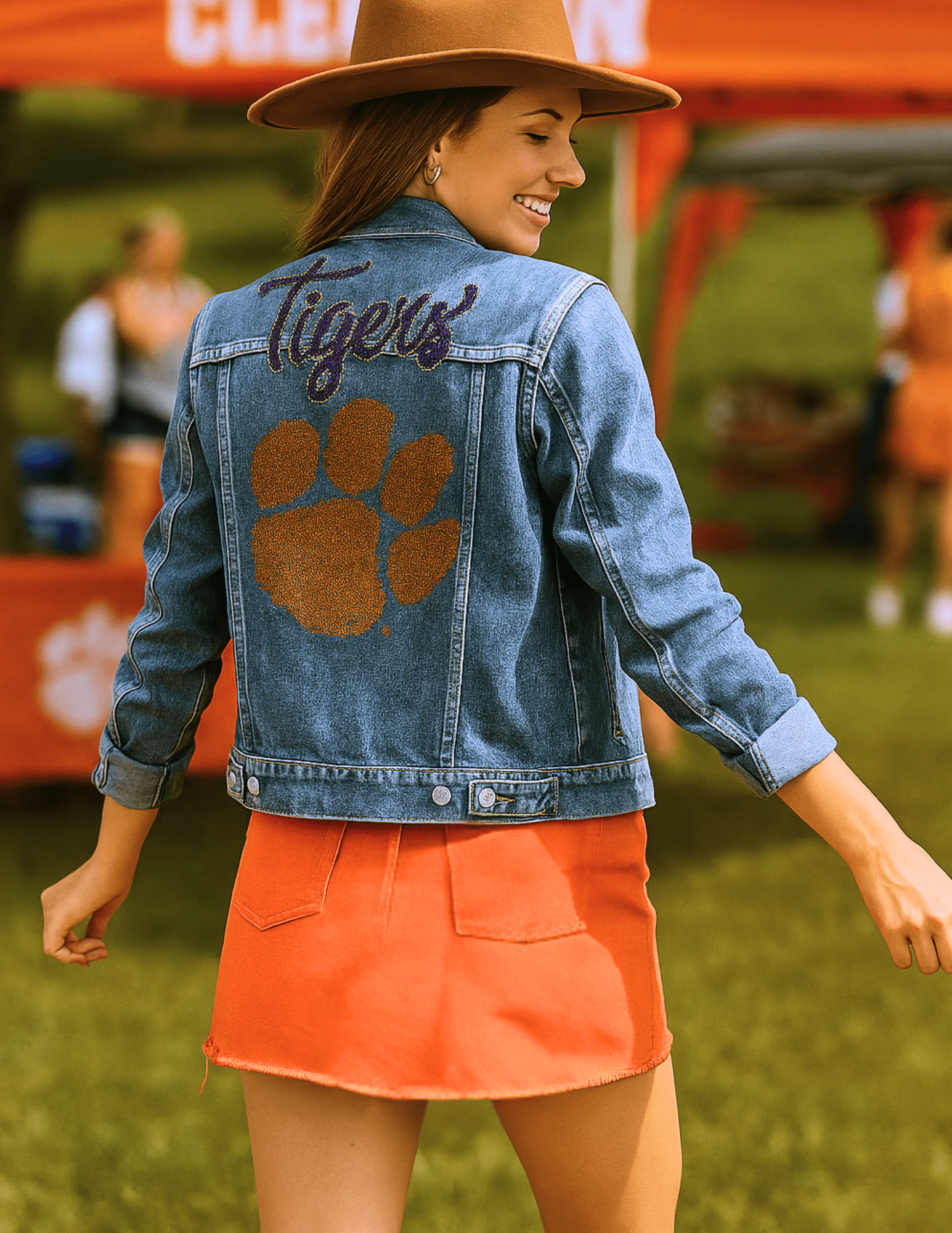 Step up your game day style with this denim jacket featuring a bold Clemson Tigers design. The back showcases a large orange crystal paw print and sparkling purple “Tigers” script, blending classic denim with standout team spirit. Made from premium denim with a flattering fit, this jacket is perfect for layering over any outfit. Whether you’re at the game, tailgating, or out on the town, this Clemson Tigers rhinestone denim jacket is a must-have for fans who love mixing fashion and fandom.