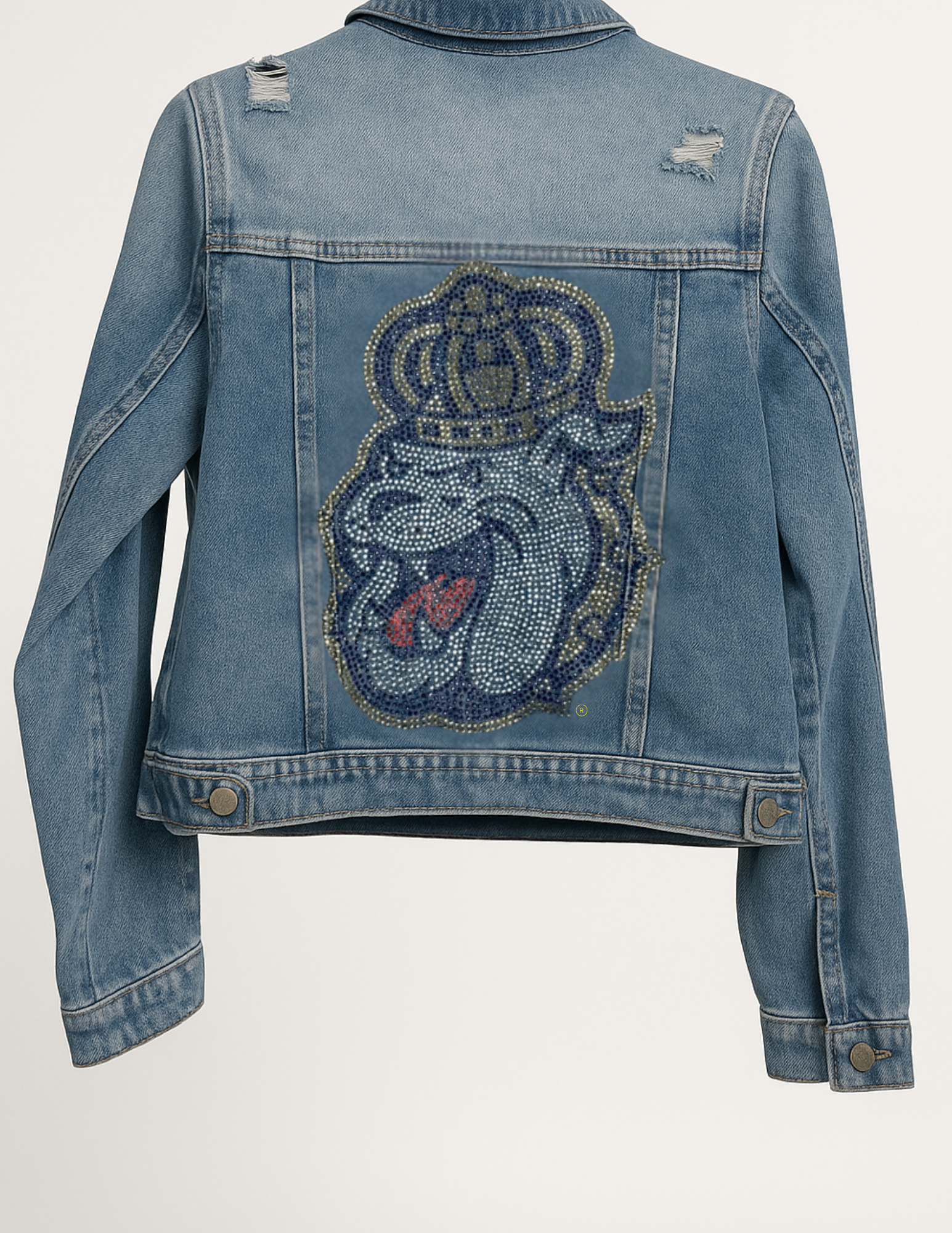 Show your school spirit with our Game Day Jacket in Blue Denim. This premium outerwear features a crystal JMU Bulldog embellishment that catches the eye at every game. Crafted from quality denim, it combines durability with collegiate style, making it perfect for game days, campus events, or casual wear. The versatile design transitions seamlessly from stadium to street while proudly displaying your university pride.
