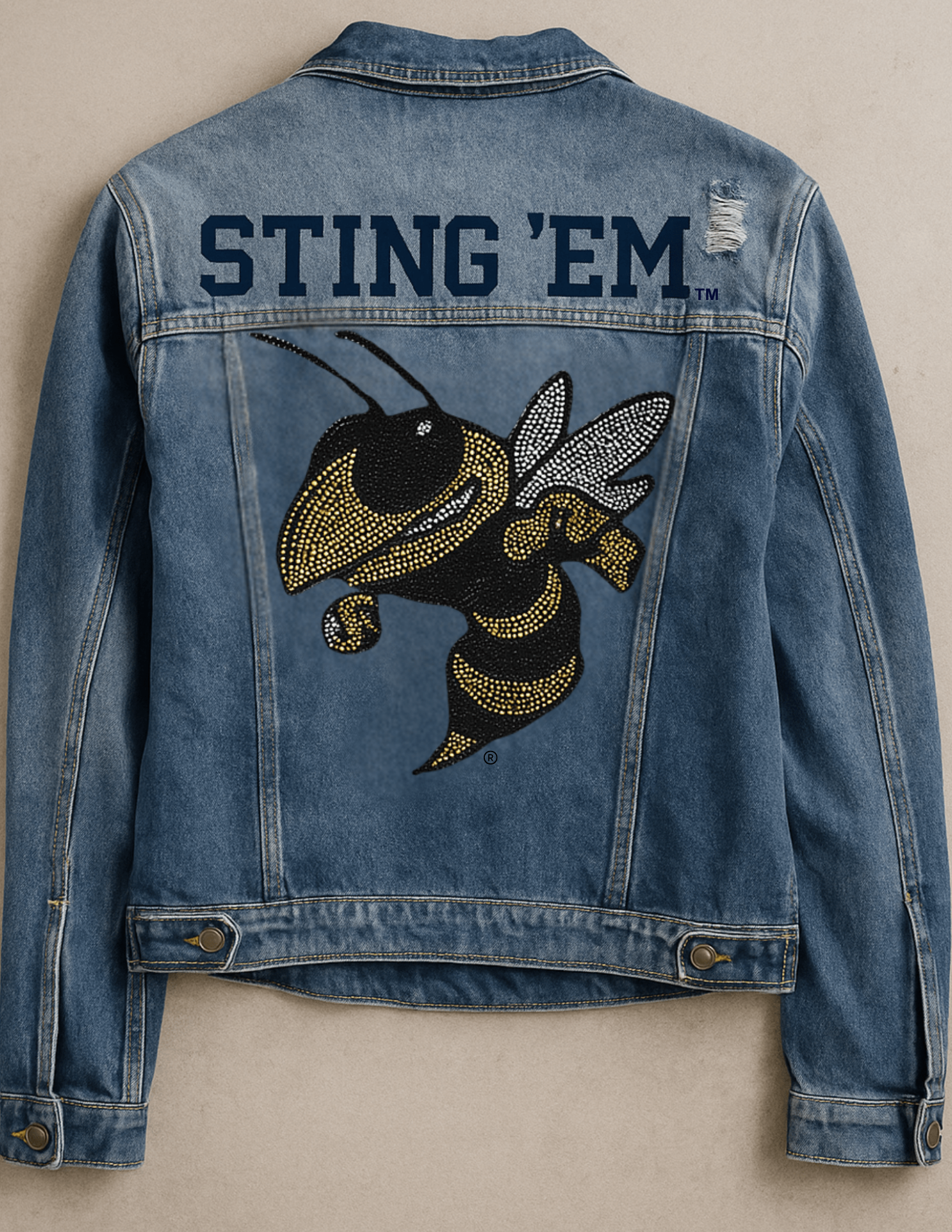 Show your Yellow Jacket pride in bold, crystal-clear style with our Georgia Tech “Sting ’Em” Rhinestone Denim Jacket. This women’s jacket features a dazzling rhinestone Georgia Tech mascot on the back and “STING ’EM” text across the shoulders, making it the ultimate statement piece for game day or campus events. Designed with distressed denim for a vintage-luxe feel, this jacket blends comfort, edge, and school spirit. Pair it with boots or sneakers for the perfect sporty-chic look.