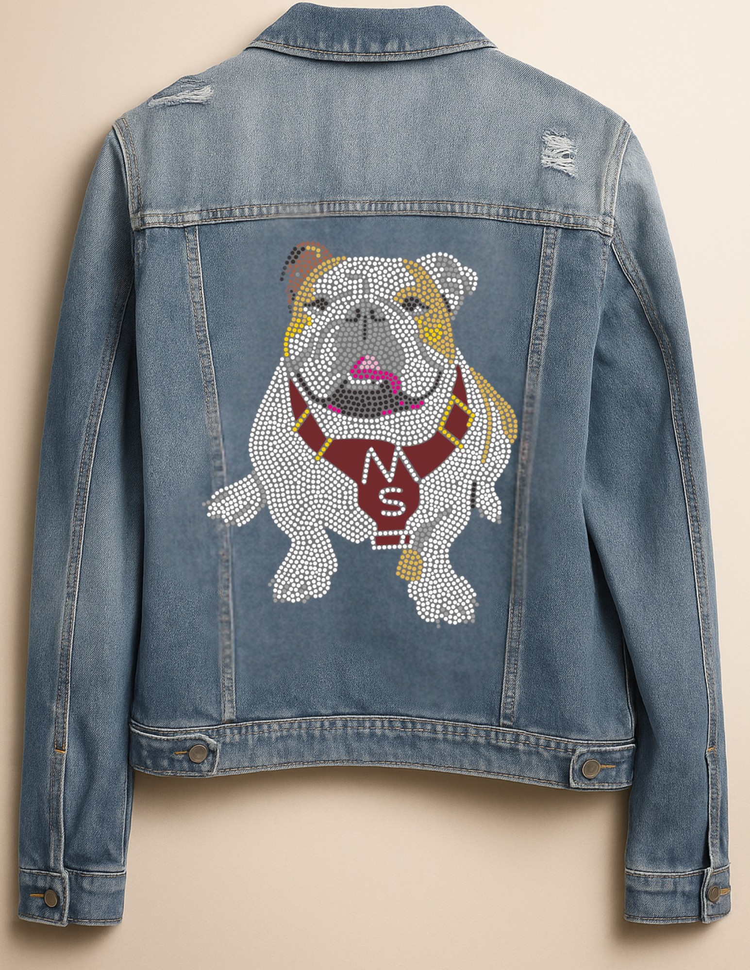 Elevate your Mississippi State pride with our premium Game Day Jacket in classic blue denim. This expertly crafted outerwear features a stunning full bulldog design enhanced with eye-catching rhinestone embellishments. Perfect for game days, alumni events, or showcasing your team spirit around campus. Combines collegiate authenticity with fashion-forward detailing for the dedicated Bulldogs fan.