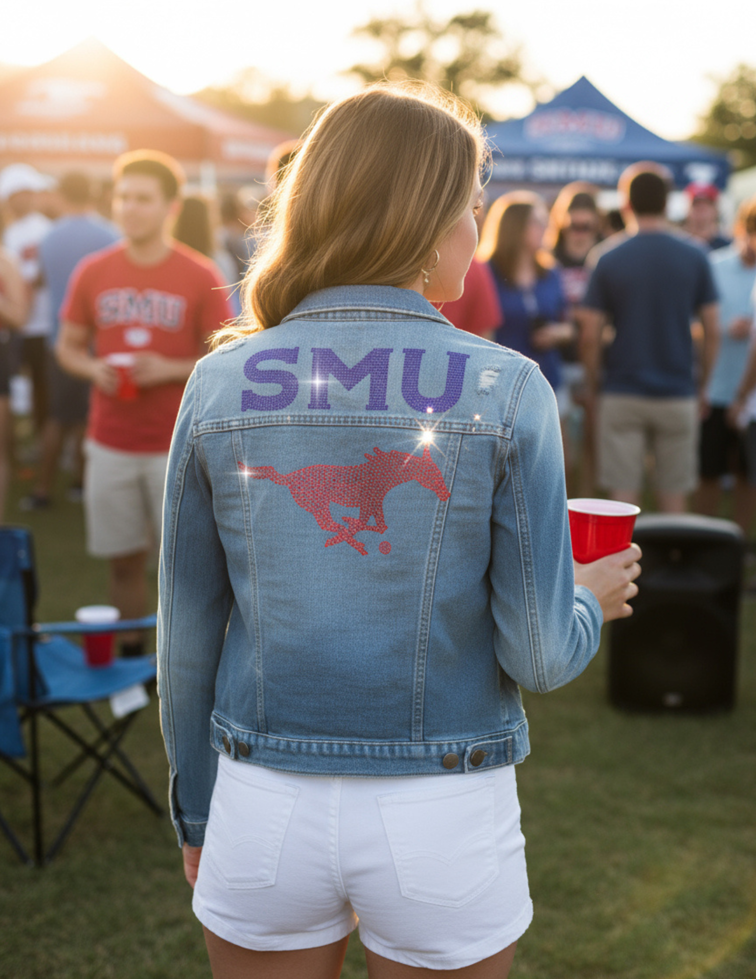 Show your SMU Mustang pride with this Game Day Jacket in classic blue denim. Featuring a striking logo crafted entirely from rhinestones, this jacket offers a unique sparkle that stands out at every game. Durable denim construction ensures lasting wear, while the expert detailing highlights your team spirit with style and authenticity. Perfect for cheering on the Mustangs in comfort and confidence.