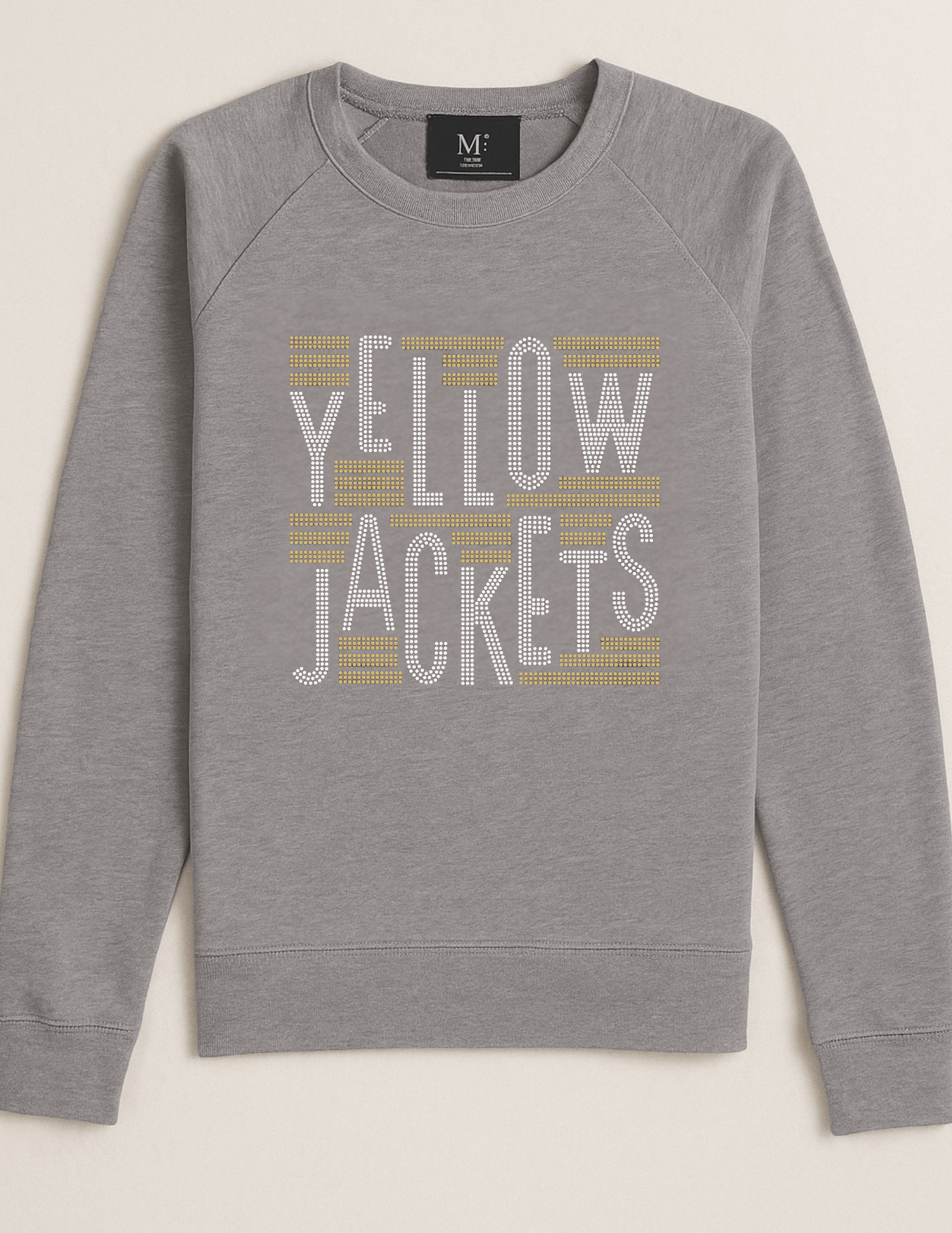 Show your team pride in style with our Yellow Jackets rhinestone sweatshirt. This cozy heather gray crewneck features bold, sparkling “YELLOW JACKETS” lettering in clear and gold rhinestones, creating a standout look that’s perfect for game days, campus strolls, or casual weekends. Crafted from soft, mid-weight fleece with ribbed cuffs and hem, it offers both comfort and a flattering fit. Whether you’re cheering from the stands or repping your school on the go, this design adds a touch of glam to your collegiate wardrobe.