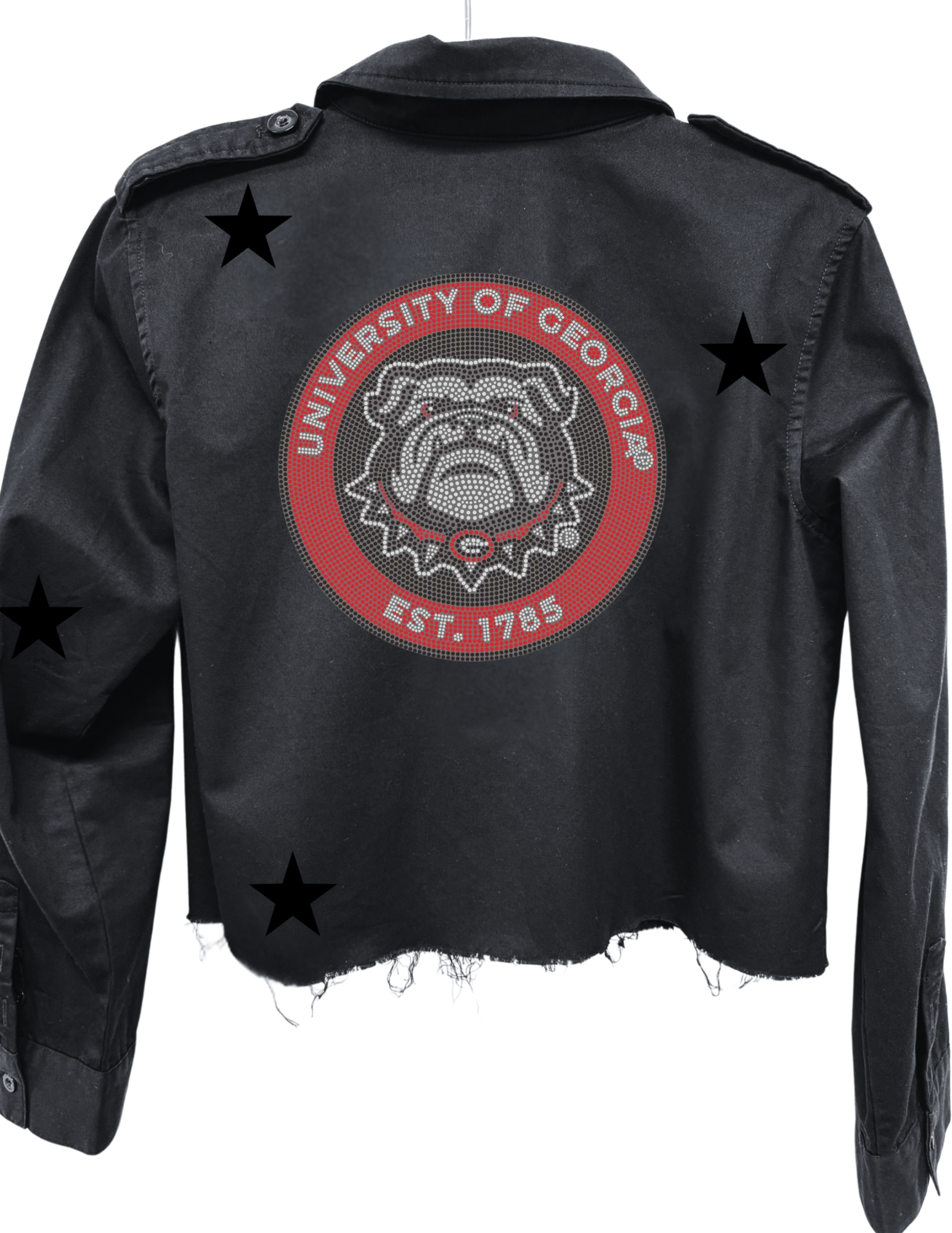 Elevate your game day style with this University of Georgia shacket in classic black. Featuring a striking rhinestone logo that captures the Bulldogs' iconic pride, this versatile piece layers effortlessly over any outfit. The structured shacket silhouette offers the perfect blend of shirt and jacket comfort, making it ideal for tailgates, campus walks, or casual wear. Crafted for durability and designed to showcase your Georgia Bulldogs spirit, this timeless piece celebrates the university's rich heritage since 1785. Perfect for devoted fans seeking authentic, quality apparel that makes a statement.