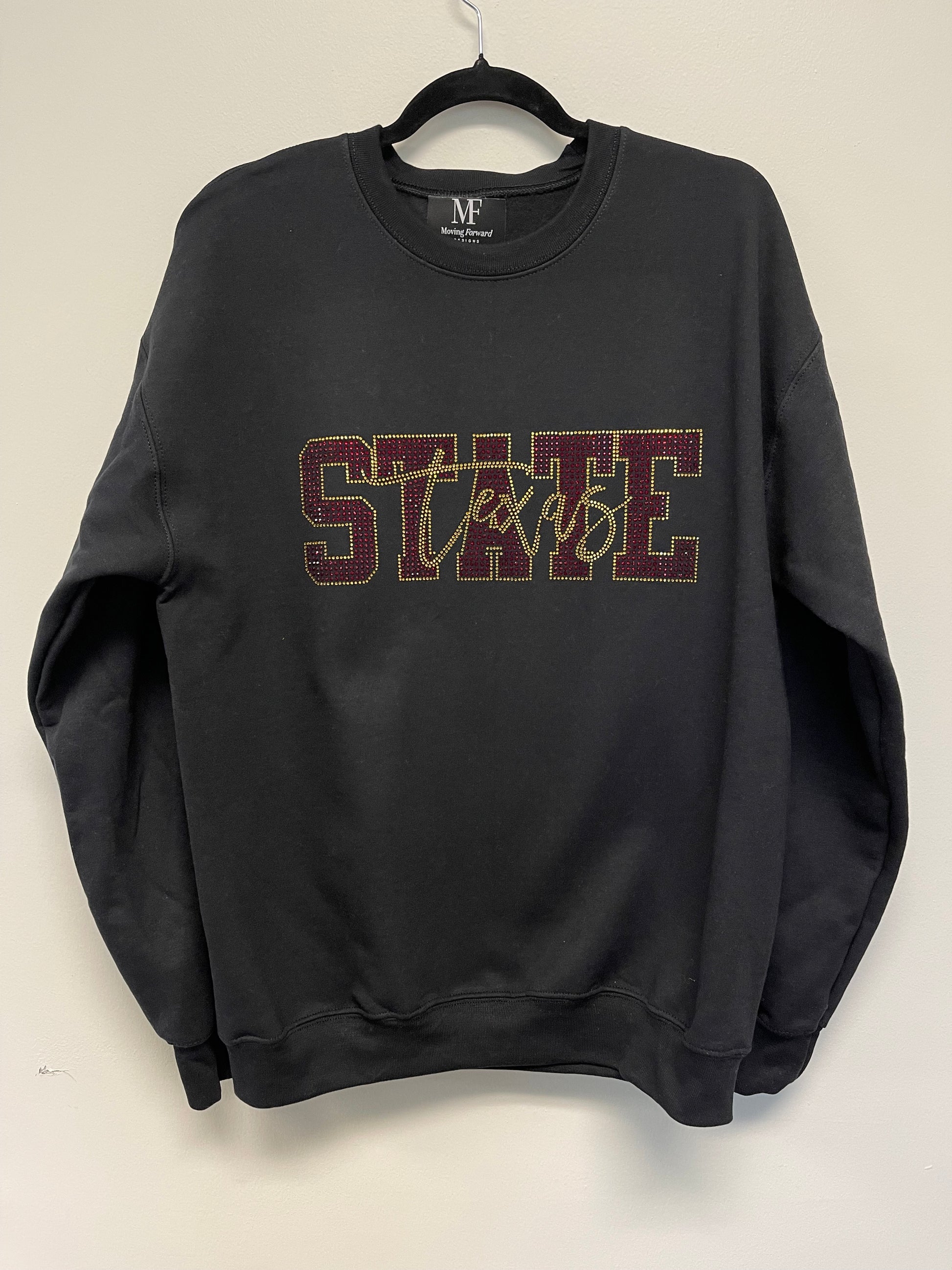 Show your Texas State pride with this black crewneck sweatshirt featuring sparkling rhinestone details. Crafted for comfort and style, it offers a perfect blend of warmth and eye-catching design, ideal for game day or casual wear. Durable fabric ensures long-lasting wear while rhinestones add a subtle, sophisticated shine that stands out in the crowd.