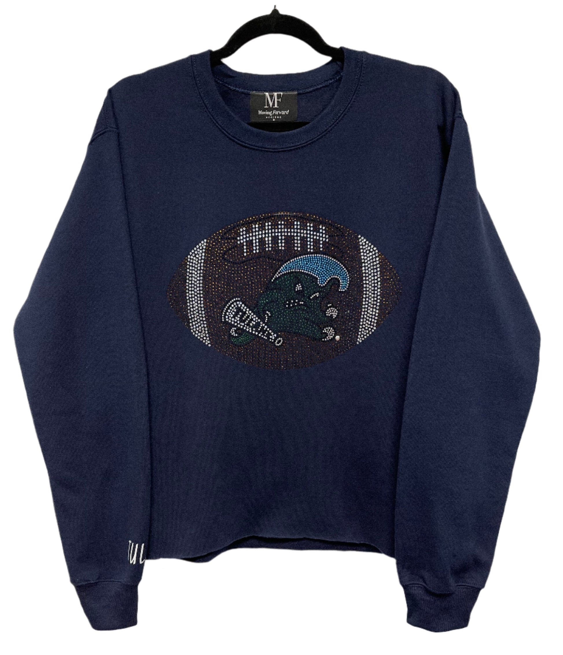 Show your Tulane football pride with this navy crewneck sweatshirt, featuring a stylish wrist design crafted from sparkling rhinestones. Perfect for game day, it combines comfort with eye-catching detail, making it an expert choice for fans who want to stand out while supporting their team.