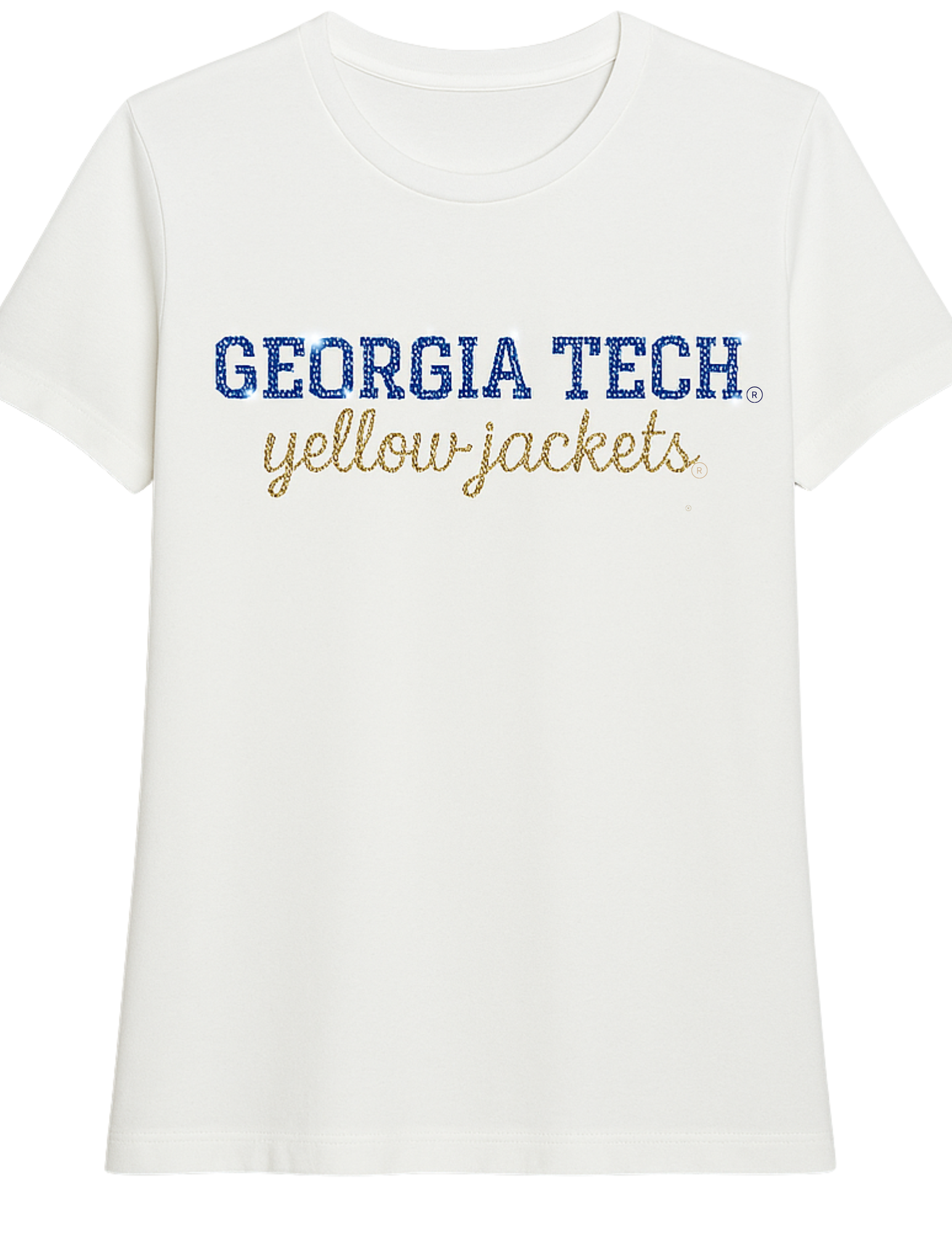 Georgia Tech Yellow Jackets White Crewneck T-Shirt with Rhinestone Script Display your Yellow Jackets allegiance with this officially licensed Georgia Tech crewneck tee, showcasing a dazzling rhinestone script logo across the chest. Designed for devoted fans and alumni, this premium white t-shirt combines comfort with standout style, making it an essential addition to any game day collection.Â