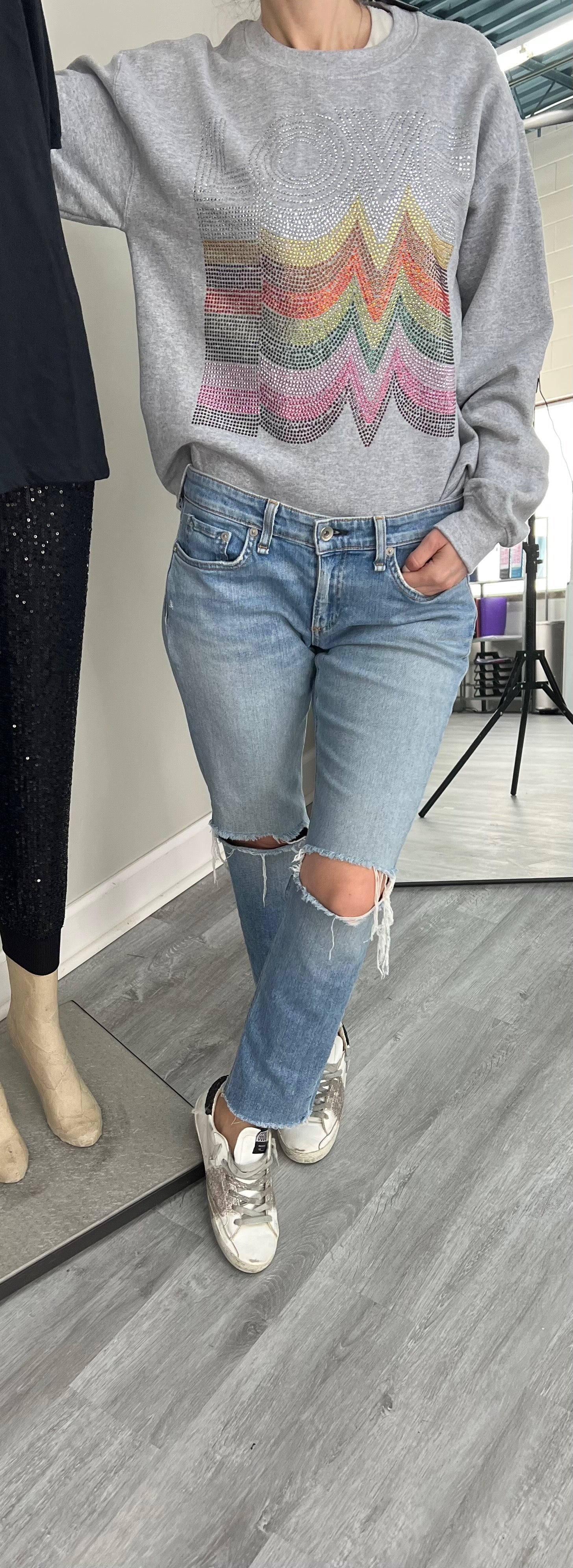 You don't have to do anything to break in this crewneck sweatshirt. Absurdly soft fleece looks as easy and classic as it feels—layer on over a tank or rock as is. Either way, you are sure to look just as cute as you are comfy! This one features our popular crystal love repeater design and a raw hem. Perfect for adding a touch of style to any outfit.