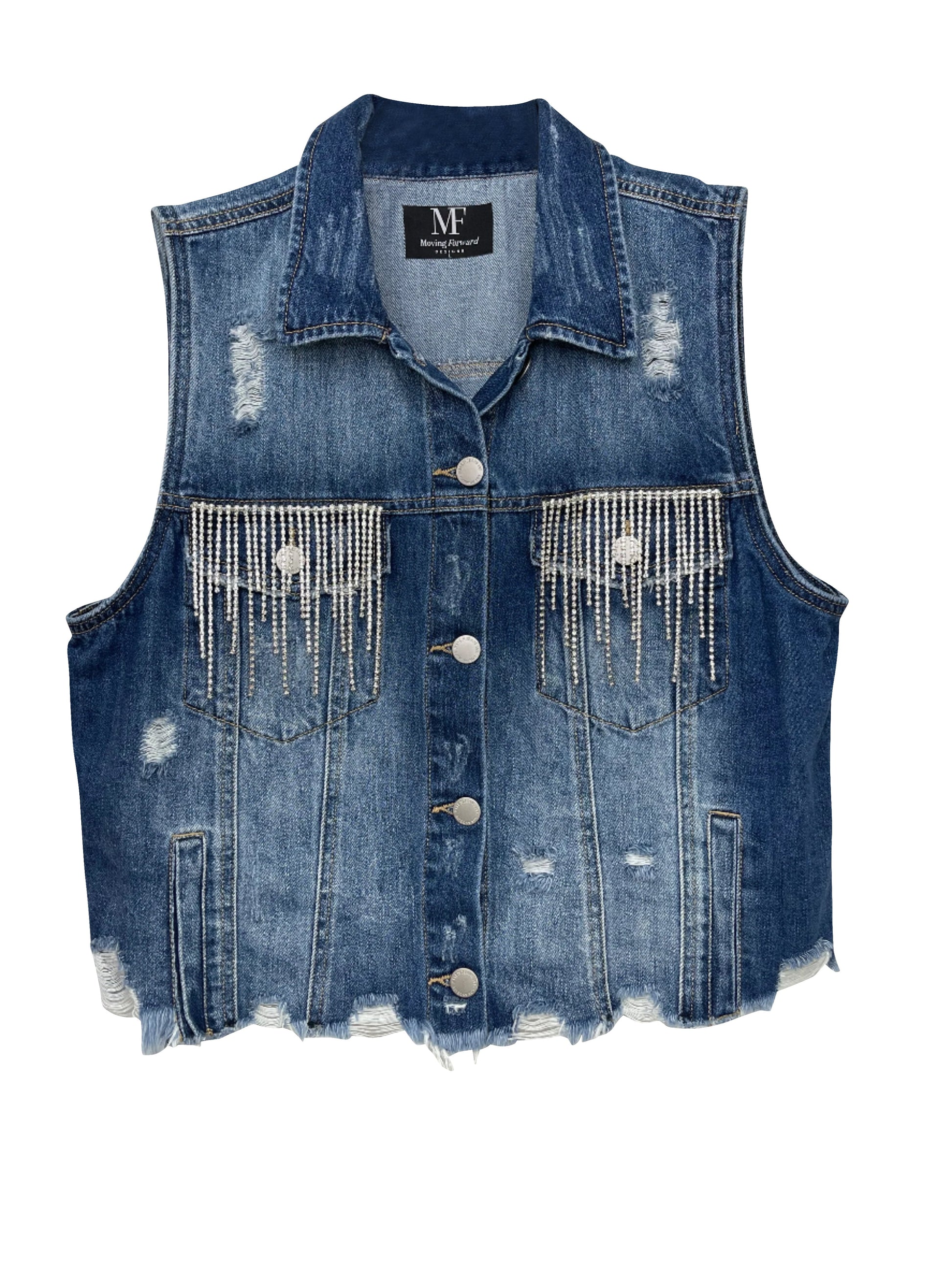 This denim vest features dangling rhinestone fringe on the front pockets and star fringe along the back for a stylish and unique design. Made with distressed denim and a raw hem, it is the perfect addition to elevate any outfit.